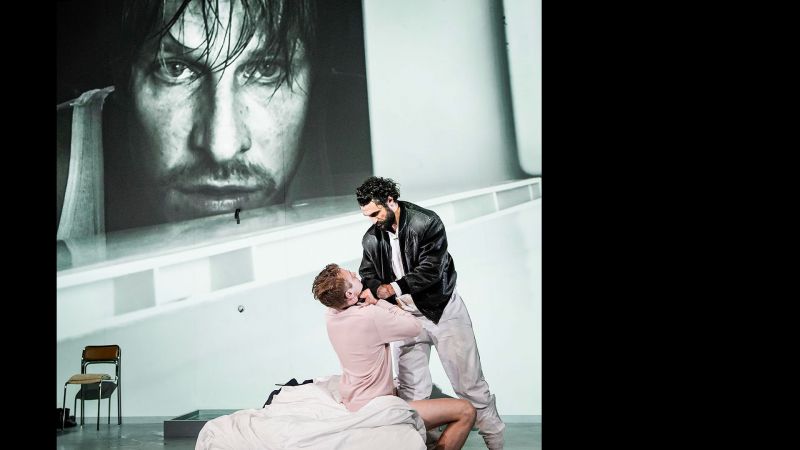 Récit à la structure fragmentée, polyphonie des voix et mise en abyme du discours d’Edouard Louis, le narrateur et protagoniste, contredit par sa sœur Clara, dialogues avec les policiers, les médecins, avec Réda… sont les chaînons tissés entre eux d’une trame serrée que respecte Thomas Ostermeier. Le récit est ainsi simplement mis à plat, suivi au plus près et en adresse directe au public. On se passe le micro, on se filme aussi offrant sur écran large une autre perspective, plus intimiste, moins clinique. Mise en scène sans affect apparent, abordée comme l’analyse d’une scène de crime et de sa reconstitution. C’est d’ailleurs la première et la dernière image de cette mise en scène, des hommes en combinaisons blanches, experts scientifiques passant au peigne fin le plateau. Thomas Ostermeier s’en tient donc au fait, au récit, suivant une ligne claire et sans ambages, sans affèterie, sans effet dramatique. La scène de viol en est l’acmé, frontale, crue, violente. Glaciale dans sa nudité. Les comédiens se partagent les rôles, passant de l’un à l’autre sans transition, les scènes s’enchaînant en toute fluidité, à l’exception d’Edouard Louis (Laurenz Laufenberg), étonnamment et troublant quasi sosie du vrai Edouard Louis, jusque dans sa démarche. Appuyant de fait la véracité d’un fait vécu par l’auteur, évacuant toute fiction et toute distance. La thèse n’est plus une théorie mais procède d’une réalité, d’une expérience. Procédé initié par Didier Eribon dans Retour à Reims, être l’objet et le sujet, voire le matériau, de son étude. Thomas Ostermeier ne s’y est pas trompé demandant à Edouard Louis de collaborer à l’écriture de cette adaptation théâtrale de son récit.