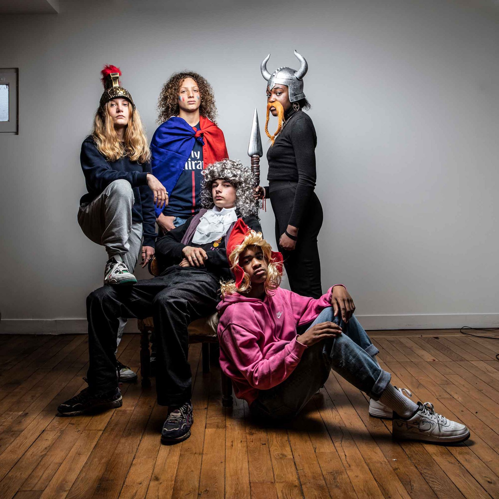 Le projet d’Amine Adjina, estampillé « jeune public », est un vrai projet de théâtre politique – s’élever contre un récit qui occulte des pans entiers de l’histoire, écrite par les dominants, plus encore que par les vainqueurs, et le jouer devant des classes, quand l’école devient de plus en plus un lieu frileux et apolitique. On pourrait regretter que le propos reste un peu rudimentaire. Ainsi, les évènements revisités sont la préhistoire, Vercingétorix, la Révolution française et la victoire de la France en 1998. Ce sont des évènements qui restent « consensuels », et le sont encore plus par la façon dont ils sont ici traités : la Révolution est la grande revanche des dominés, la victoire de 1998 est l’acmé sublime de la France « black blanc beur ». Ces interprétations sont sans doute irénistes, et l’historiographie récente est depuis revenue sur cela. Si la pièce est la continuation d’une autre pièce, Arthur et Ibrahim, elle ouvre également la voie vers une trilogie qui traitera d’autres évènements.