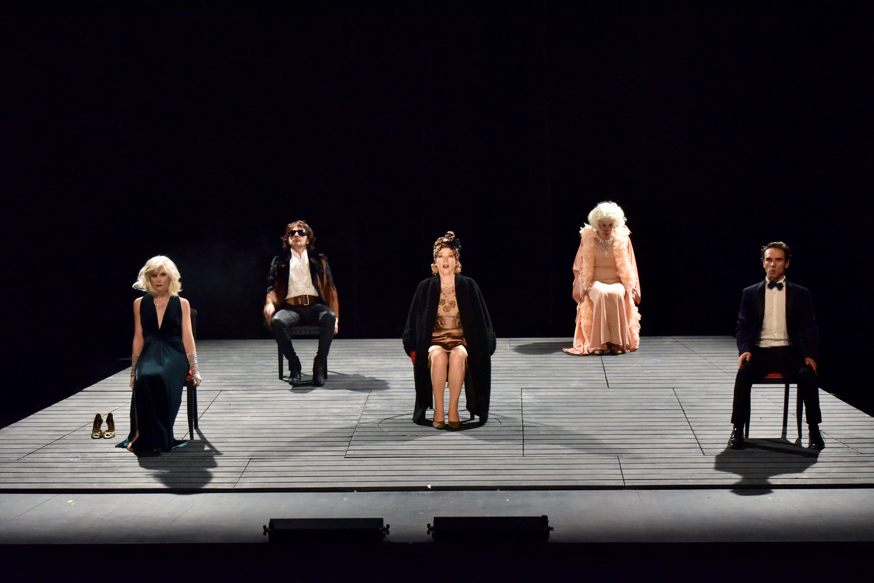 Hollywood Boulevard mise en scène de Franck Berthier se veut une interrogation sur le système hollywoodien, la fabrique d’une star au service d’une industrie tout à la fois usine à rêves, illusions et fantasmes, également machine à broyer ceux-là même qui la servent. Deux sources d’inspiration pour les comédiens – il s’agit d’une écriture collective – Sunset Boulevard (Billy Wilder, 1950) et Opening Night (John Cassavettes, 1977), dont ils tirent les fils pour une œuvre fragmentée, un drôle de puzzle à vrai dire, où se croisent légende oubliée, jeune actrice en star déboussolée, producteur pygmalion, réalisateur-scénariste sur la touche et fauché. Ajoutons une échotière vipérine pour relier l’ensemble quelque peu et malgré tout décousu. Très vite on ne tarde pas à jouer au jeu de qui est qui. Là on reconnait certes Norma Desmond, le personnage incarné par Gloria Swanson ancienne star du muet,  ici – incontournable – Marylin Monroe. Mais on pourrait y ajouter d’autres visages, la liste est longue des victimes des studios hollywoodiens. Mais de Gena Rowlands, de son personnage Myrtle Gordon, indissociable d’Opening Night, on cherche en vain la trace. Seule la commère Hedda Hopper garde son nom. C’est le destin de ces deux actrices, mis en parallèle et finalement identique, l’un préfigurant l’autre, auquel plus particulièrement il est fait référence. On ne naît pas star, on vous fabrique, c’est une construction réfléchie au service d’une industrie essentiellement masculine dont les critères, pour ne pas dire les fantasmes, obéissent à des normes bien précises. Glamour, sexe et rentabilité. Ces stars une fois dépouillées de leurs attributs, mise à nue, au réel comme au figuré, n’existent plus. Elles ne sont que des images, des légendes sur celluloïd et papier glacé sur lesquels on éjacule et qui finissent par les broyer. Qu’importe que Stella Lester ai joué La Mouette de Tchekhov (c’est quand même incroyable que cette Mouette soit toujours la référence récurrente pour toute actrice débutante…), ce qui lui est demandé n’est pas de cet ordre-là. On pense bien évidemment à l’affaire Weinstein qui éclaire d’un jour glauque les dessous pas très propre d’une industrie prospère. La relation entre Sam Murray, le producteur et découvreur de Stella, et son actrice est sans équivoque ici. Plus loin, dans une scène où en crise elle se barbouille de maquillage on songe, pour qui a vu cette séquence, à cette starlette, Anna Nicole Smith dont la déchéance tragique reste dans les mémoires. Souvenons-nous de cette scène terrible où son mari la filmait, égarée, droguée, se barbouillant elle aussi de maquillage… Mais ici dans Hollywood Boulevard nous n’échappons malheureusement pas aux clichés et le boulevard devient très vite une impasse. Tout cela, tout ce qui est dit et joué n’échappe pas à une vérité que nous n’ignorions pas, que nous n’ignorons plus. Propos battus et rebattus dont les films (on peut y ajouter l’exceptionnel Mulholland Drive de David Lynch, 2001) et les personnalités auxquels il fait référence de manière directe ou indirecte ne suffisent pas ici à alimenter une réflexion qui, et très vite, tourne en rond, prisonnière sans doute de ces références écrasantes qu’il aurait été nécessaire de dépasser pour ne pas tomber dans les poncifs… Et là, Myrtle Gordon manque cruellement. Ce n’est pas la mise en scène – malgré un manque évident de rythme – ni la scénographie, ce ne sont pas les comédiens, au demeurant tous excellents, Francine Bergé en tête en vieille poupée Barbie peroxydée, lucide et paumée tout à la fois, qui sont ici en cause mais bien ce discours rabâché, sans vraiment de recul ni de profondeur, qui n’apporte rien de plus. Les interventions d’Heda Hopper (qui apparaît dans Sunset Boulevard dans son propre rôle) apporte un peu d’humour mais reste bien inoffensive, de l’ordre du potin, au regard d’une réalité bien plus tragique. « La rencontre d’une pathologie individuelle et de l’appétit insatiable d’une culture de consommation capitaliste. Comment comprendre ce mystère ? Cette obscénité ? » écrivait Arthur Miller à propos de Marylin Monroe. C’est justement ce mystère-là qui demeure qu’ Hollywood Boulevard ne réussit pas à percer.
