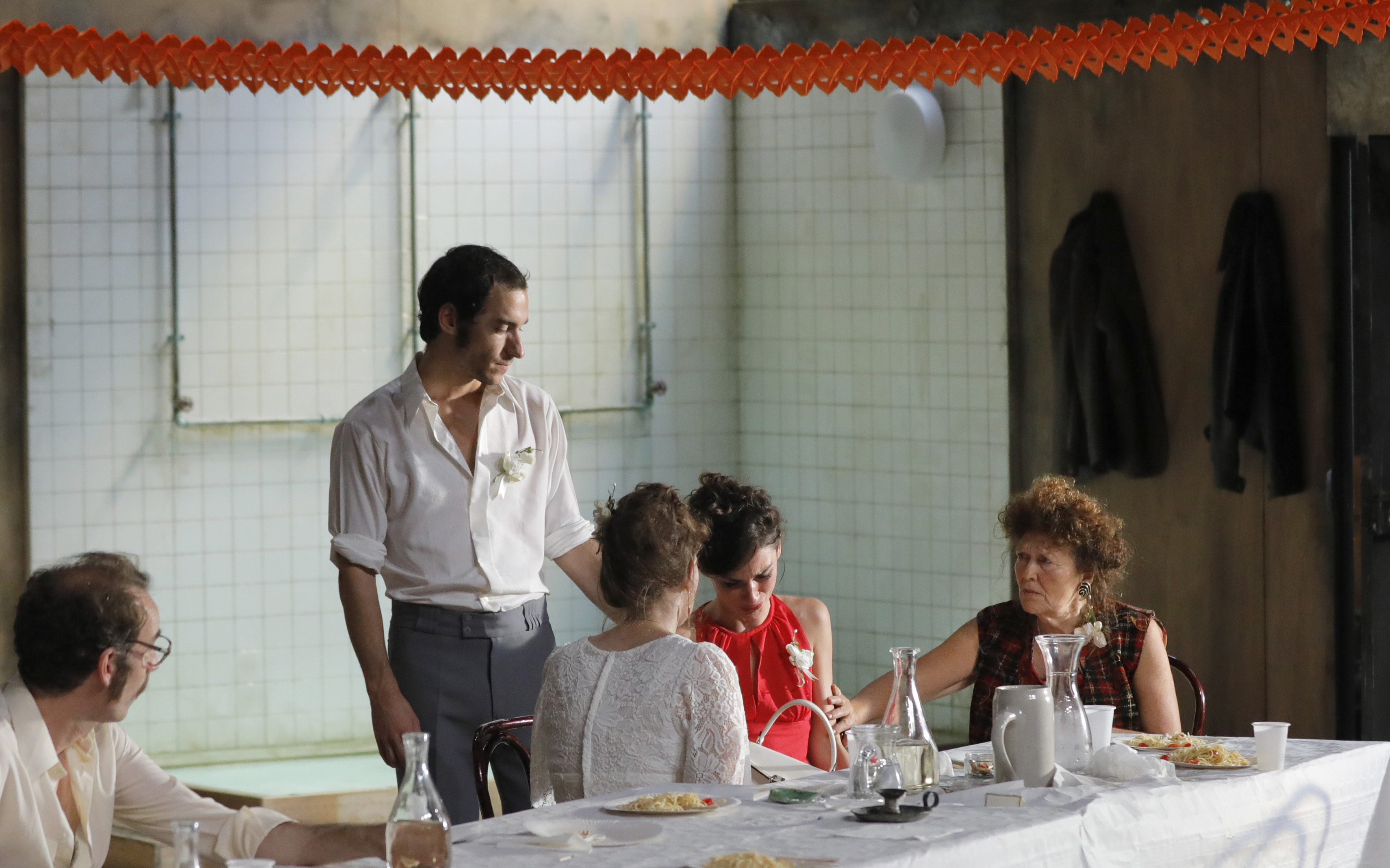 Ce lieu, composite et pourtant si parfaitement identifié, nous y pénétrons spectateurs et acteurs comme par effraction dès l’ouverture de Huit heures ne font pas un jour. Comme chez Tchekhov, on entend d’abord des voix hors champ : une foule de petits cris, de rires, de bousculades, de disputes joyeuses, une liesse bagarreuse. Puis débarque, cherchant refuge, tout ce petit monde trempé par la pluie : la famille Krüger-Epp rassemblée ce dimanche pour une fête d’anniversaire qui vient d’être interrompue par une averse dans un parc voisin. Dans cet espace de l’usine et du monde ouvrier, se tient une fête de famille. Dans un monde scindé se rejoignent alors des mondes séparés.