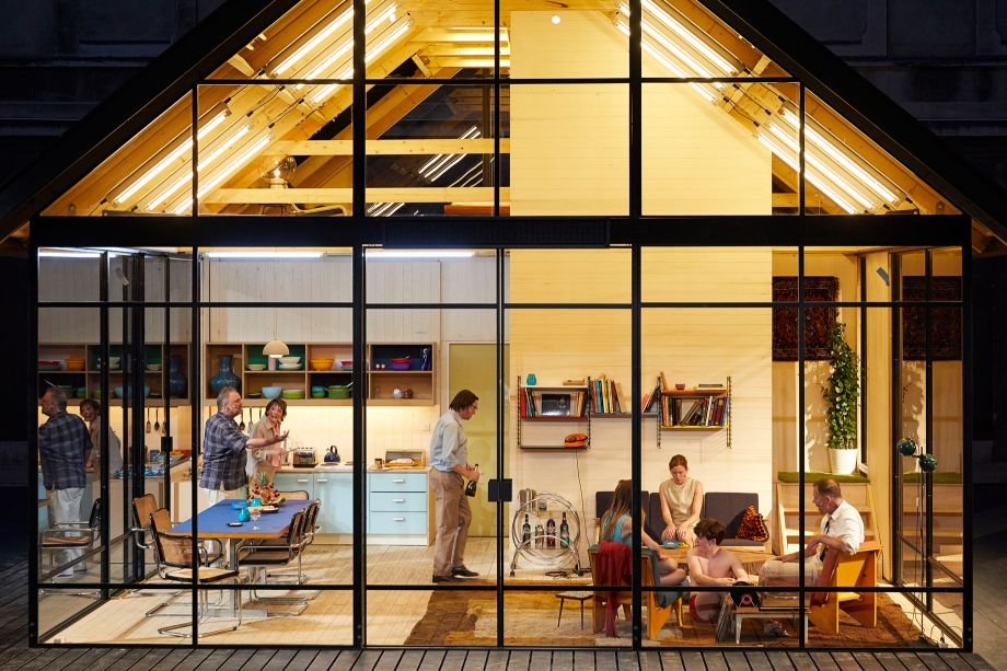 Au centre de la scène trône une maison construite comme un kit. Elle est dans la fiction la maison de vacances de la famille Kerkman, elle est la maison-mère, elle est le personnage principal de la pièce. Pour en dire d’avantage sur cette scénographie magnifique et tout à fait ingénieuse, la maison, toute construite de baies vitrées, invite – nous les curieux et les voyeurs venus au théâtre – à passer au travers de la transparence de ces immenses murs de verres, et à nous plonger dans l’opacité intime et la noirceur des drames familiaux qui se jouent sous nos yeux. La maison s’élève sur un plateau tournant qui manipule notre attention et notre regard, rythme à la perfection les séquences, reconstruit en permanence l’espace de la scène, et permet de démultiplier ou de jouer simultanément des scènes dans les différents espaces de la maison.
