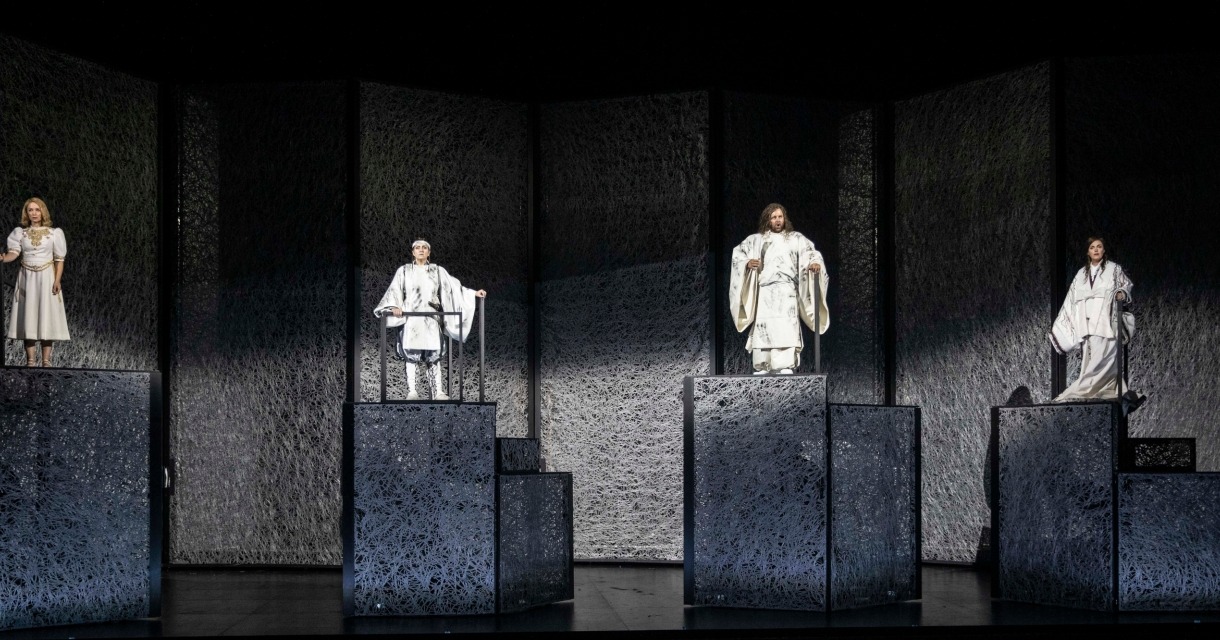 Metteur en scène d’origine japonaise, nous avions pu voir ses propositions autour du Mahabarata et d’Antigone au Festival d’Avignon, dont les décors et les compositions picturales nous restent en mémoire. Ici il renouvelle un gigantisme scénographique fait d’un ballet de volumes et de paravents mouvants, dont les déplacements bruyants et fastidieux polluent parfois la musique. Sur ces socles agités, les chanteurs y trônent comme des statues de marbre contraints et inexpressifs. La mise en scène déborde de formel, écrase l’action et les enjeux de la fable, fait du roulement inéluctable de la tragédie de pauvres placements statiques et des duos passionnels ou contrariés un face-public systématique au regard lointain et vague. Autant dire qu’aucune vie ne prend forme au plateau, et si encore la forme qui contraint les corps était un temps soit peu sculptée et travaillée, cela pourrait avoir son effet… Malheureusement ce n’est guère le cas, et les rares moment de danses donnent lieu à des chorégraphies gênantes, enfantines et maladroites.