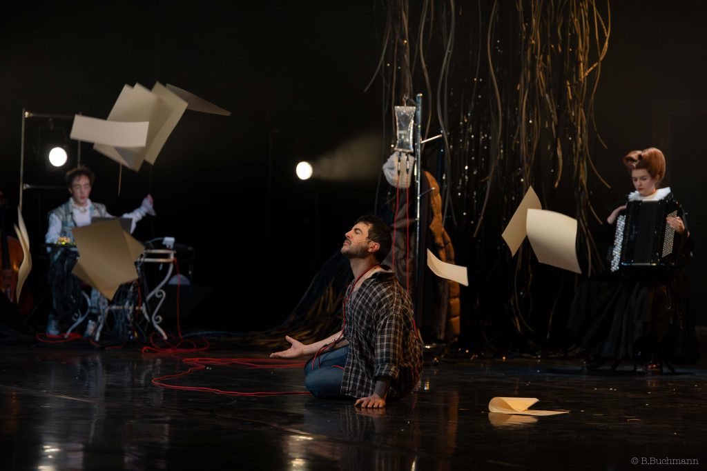 Le baryton au grave généreux joue de sa complicité avec Julia Sinoimeri et son accordéon, qui semble improviser selon les états d’âme du poète dans sa parure austère de ménine élisabéthaine. Theodore Vibert à la console électro acoustique musique l’ambiance, le temps pluvieux, le souffle du vent.