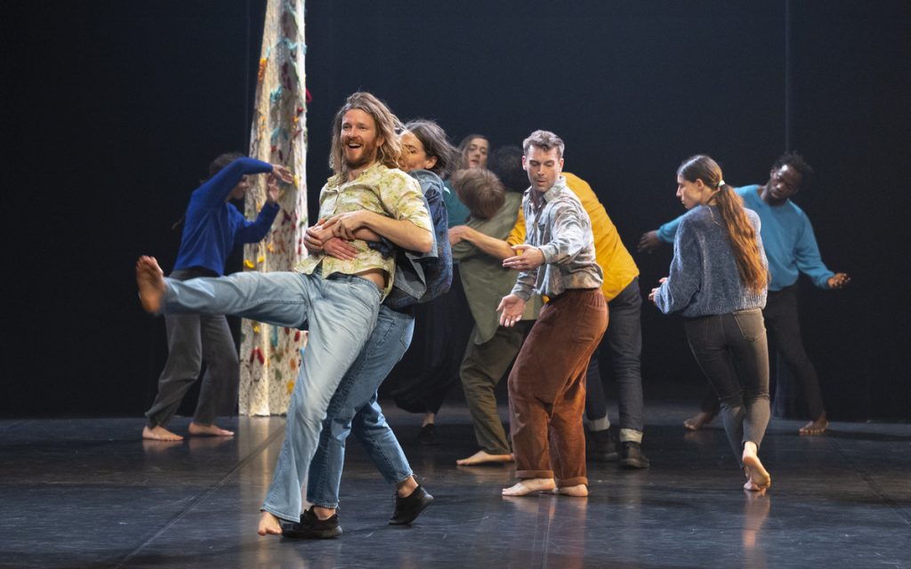 Devant une telle pièce, les spectateurs sont tantôt invités à se focaliser sur l’un des interprètes, tantôt prendre du recul et observer l’ensemble du groupe. Car c’est parfois dans les détails et à d’autres moments dans le tout que le sens de In Comune prend forme. Dans cette mosaïque des mouvements, dans la valse des costumes colorés, chaque geste en appelle un autre, souvent dans l’immédiateté, mais aussi parfois à plus long terme. C’est qu’Ambre Sanatore a cette faculté de déceler chez les individus leurs particularités, leurs habitudes, leurs tics, ce qui fait de chacun un être singulier et pourtant si connecté aux autres. Voire même connectés aux êtres vivants des autres espèces, animales, végétales. Comme en écho, la naïveté d’un comportement individuel peut amener de la malice chez les autres qui l’entourent. Ce qui fait la ritournelle de la vie, les itérations du quotidien, l’absurdité de la répétition inconsciente des gestes, comment une rencontre peut impacter une journée, voire une vie… C’est tout cela que la chorégraphe parvient à retranscrire de façon impressionnante.