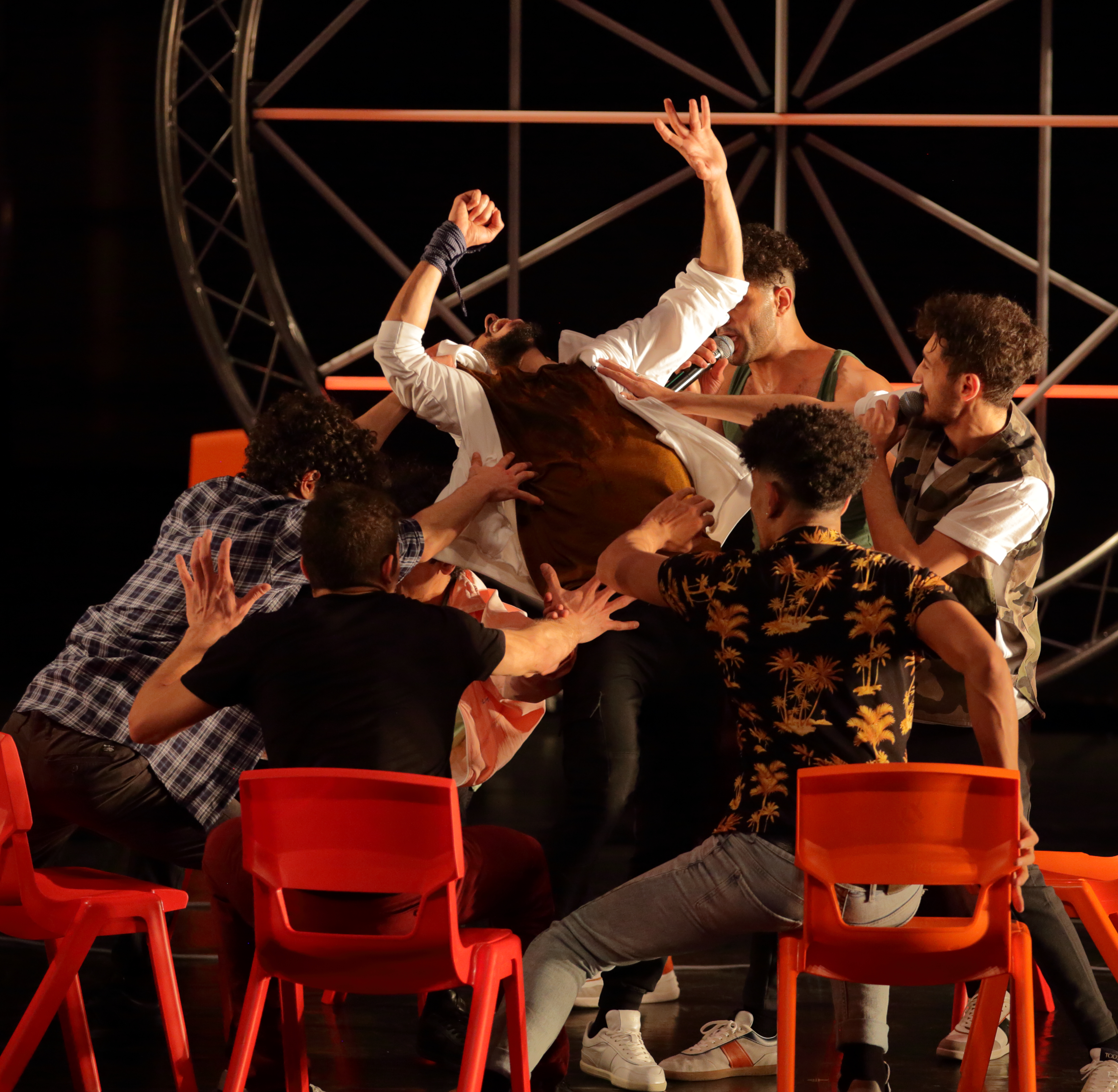 Itmahrag ou « festoyons », néologisme à partir de mahraganat (festivals en arabe), dont Olivier Dubois signe sa nouvelle pièce. Le mahraganat ou electro chaâbi aurait pu passer inaperçu comme un simple courant musical pas extraordinaire ; seulement l’ampleur de l’adhésion populaire, notamment après la Révolution de 2011 au-delà même des quartiers ghettoïsés où cette musique est créée, en font un phénomène social d’ampleur, une caisse de résonnance haute-fidélité de la rue, de la jeunesse égyptienne et de l’avenir.