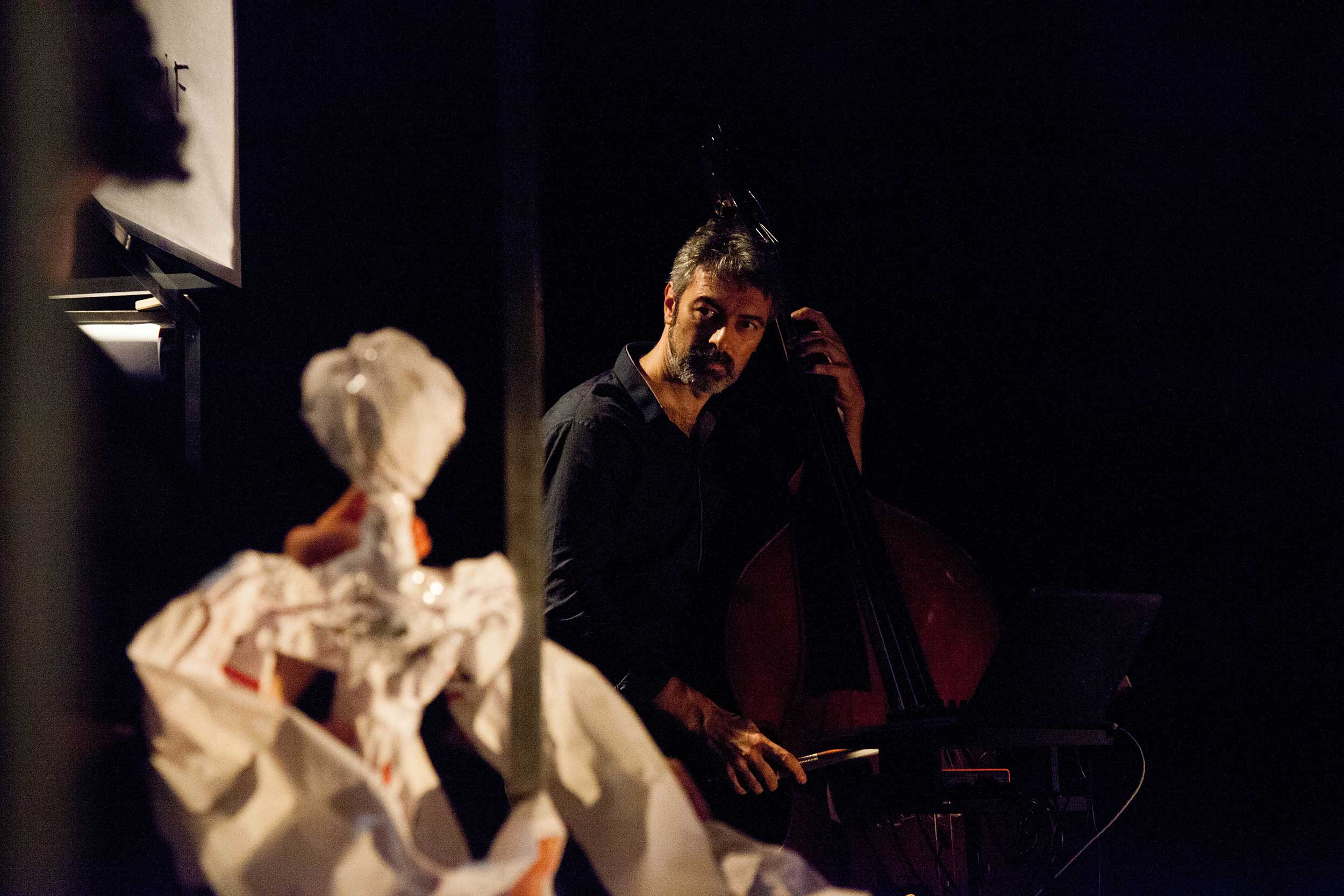 La contrebasse et la composition de Jérôme Forher qui alternent entre les sonorités occidentale et orientale n’accompagne pas seulement la narration, elle y participe pleinement tout en accentuant la dimension tragique de la création qui une heure durant se déroule dans une course folle.
