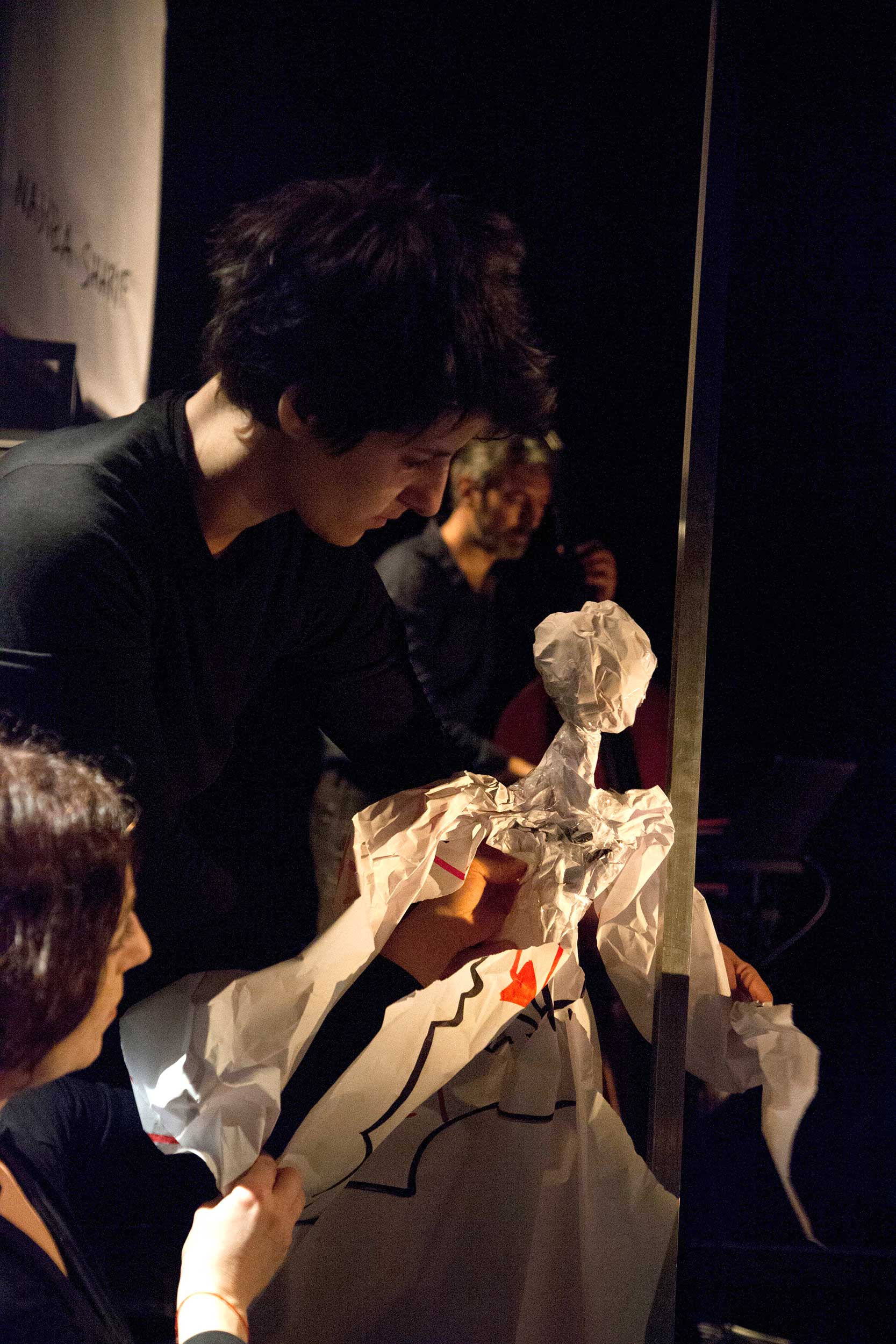 Le papier sert de medium principal à la narration. Des feuilles, puis des rouleaux, savamment chiffonnés et agencés se transforment en poupées éphémères représentant toutes ces filles et ces femmes, empêchées de s’exprimer, enfermées dans un statut social inférieur inacceptable. Le papier blanc, évidemment symbole de pureté, mais aussi bariolé par ce qui a été précédemment écrit dessus, comme autant de traces des coups portés, des blessures infligées, du sang jaillissant de ces corps séquestrés.