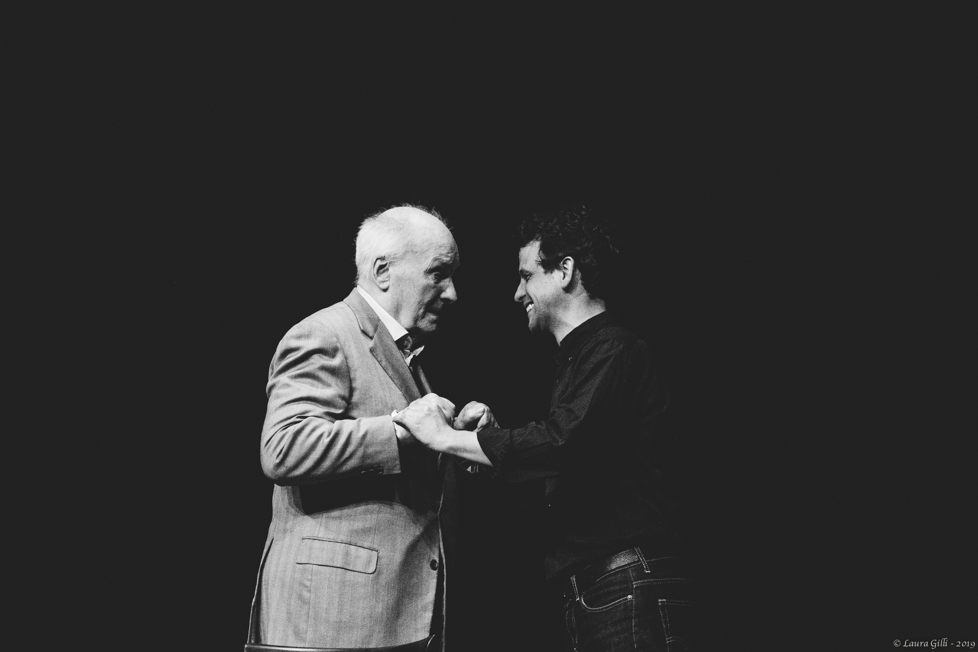 « Je ne suis pas Michel Bouquet » n’est pas une biographie de ce monstre sacré du théâtre. Si quelques éléments biographiques émergent c’est avant tout pour souligner la genèse d’une vocation, d’une carrière qui sans nul doute plonge ses racines à la fois dans un milieu familial singulier, une enfance solitaire, une période tragique – la guerre de 1939-1945 – et des rencontres qui bouleversèrent une trajectoire (Maurice Escande, Albert Camus). C’est avant tout le testament d’un artiste qui pose là, sans certitude pour autant, ce qui fut son art, sa conception d’un métier tout entier attaché à l’écriture, au propos de l’auteur, au personnage à défendre, fusse-t-il le pire des salauds. Molière, Shakespeare, Anouilh, Ionesco, Pinter, Beckett, Bernhard comme chevaux de bataille et pour mémoire… Diderot, bien-sûr, est cité, référence incontournable. Le Paradoxe du comédien étant sans doute pour Michel Bouquet la théorie la plus juste d’un art qui vous dépossède, demande à la fois « une tête de fer » mais aussi un renoncement à soi. Ne pas atteindre ça, être désincarné pour reprendre Louis Jouvet, serait alors faire « du Michel Bouquet », soit la pire des choses. Puisque sans intérêt. Mais pas plus leçon de théâtre que ça, c’est avant tout le parcours d’une vie tout entière vouée à son art, qui s’exprime ici, d’une misanthropie qui n’est qu’un faux-nez et qu’on pourrait accuser à tort d’être réac parfois, ce dont il se défend avec beaucoup d’humour. Non, disons que Michel Bouquet quoique fin observateur de notre société et de ses mutations n’affirme en aucun cas que c’était mieux avant. Différent sans doute mais pour qui s’est toujours mis en retrait, en recherche d’absolu, voire d’une liberté farouche, le monde semble s’être dissous, l’individu disparu au profit de la masse. Reste, quoiqu’il s’en défende, la transmission d’un art qui fut son cœur battant, sans cesse questionné, poli par l’expérience. Création d’après « Les joueurs, entretiens avec Charles Berling », mise en scène de façon simple, efficace et fluide par Damien Bricoteaux, et interprété par… Fabrice Lucchini. Enfin, disons que c’est avec sidération que nous croyons l’entendre. Tout y est, inflexion, diction, articulation appuyée, scansion, maniérisme, jusqu’au rictus du sourire, tant Maxime d’Aboville semble être habité, hanté voire possédé par celui-ci. Mimétisme irritant, volontaire ou non, espérons que non, et quand bien même, qui vous fait grincer des dents d’emblée et finit par parasiter et balayer l’ensemble, oblitérant malgré soi une création qui sans cela ne manque pas de qualité. « Lucchini sort de ce corps ! » a-t-on envie de hurler, fortement et rapidement agacé. Dommage. Car l’énergie et la conviction ferme de Maxime d’Aboville, son admiration pour Michel Bouquet, aurait sans nul doute emporté l’adhésion.