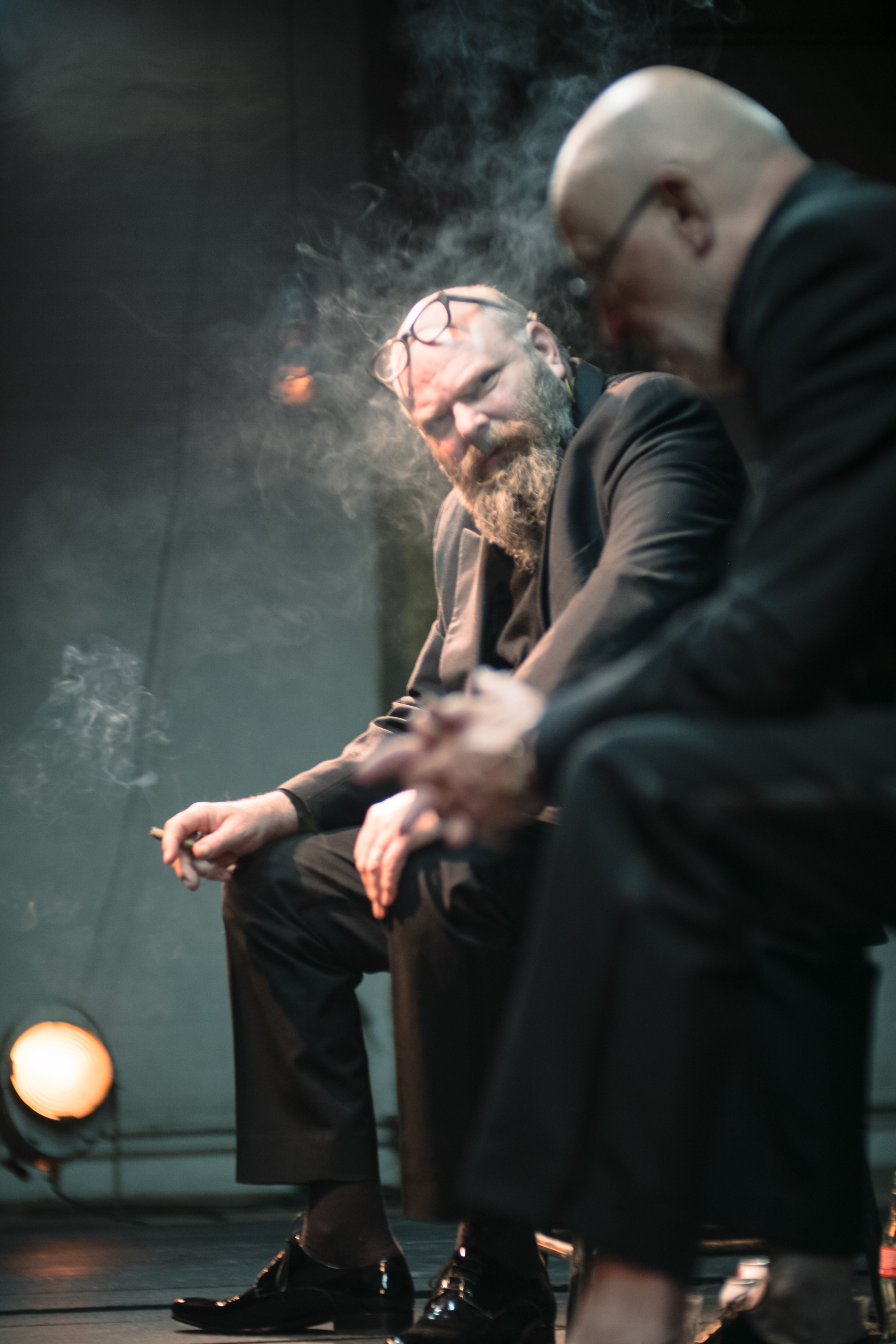 Je suis le vent, texte de Jon Fosse ou l’histoire d’une amitié, d’une vie qui tangue et roule. Mais comme toujours avec cet auteur et comme toujours avec tgSTAN et Maatschappij Discordia, c’est un peu plus compliqué et tordu que ça. Sur cette barque suspendue entre ciel et mer que figurent deux chaises sur un plancher encombré de quelques bouteilles de bière, d’eau, d’un marteau, de cordes, et un mystérieux carton suspendu lui aussi, avec pour seul horizon une bâche de toile rêche, actant de fait l’imaginaire de cette escapade préconisée par l’auteur, c’est un dialogue ressassé, déchiré de silence. Et dans ce silence-là, bientôt assourdissant, c’est toute une humanité en souffrance qui s’engouffre. En costume noir et souliers vernis, tenues des plus incongrues pour ce voyage au bout de l’existence pour l’Un, déjà mort sans doute, ces deux racontent le monde et sa détestation, la solitude partagée et le désespoir. Et cette amitié qui a su résister à tout, malgré tout, malgré l’absence, malgré la mort de l’Un, parti avec le vent, devenu le vent après ce plongeon volontaire et fatal dans l’eau glacée. Et ils sont formidables Damiaan De Schrijver et Mathias de Koning. De complicité et d’admiration réciproque, ça se voit, ils l’affirment en préambule, ce qui donne à leur jeu une autre dimension, qui déborde de la théâtralité et de la fiction pour approcher et offrir une vérité bien plus troublante. Et de cette écriture dépouillée, à l’os, ardue de Jon Fosse, ils tirent à bas-bruit et sans manière aucune, avec une étrange douceur voire ironie, des notes et des variations inattendues et d’une profondeur bouleversante. Conversation devenue presque banale ici où Jon Fosse perd de ce mystère souvent entretenu pour une lecture radicale de simplicité et de limpidité, lumineuse. Et dans les silences et les vides abrupts qui ponctuent cette conversation désespérée, plus camusienne osons l’affirmer qu’existentielle, le poids d’une vie et son absurdité éclate avec fracas. Et la force de cette création, encore une fois avec ces deux compagnies réunies pour le meilleur, c’est d’amener les spectateurs à eux, simplement, oblitérant toute distance entre le plateau et la salle qui semblent ne plus faire qu’un seul lieu pour un unique dialogue, un échange d’une fragile et délicate intimité. Dans cette barque menacée par la tempête nous sommes promptement embarqués. Parce qu’au fond, nous sommes tous dans le même bateau, l’Un, l’Autre et Nous donc. C’est d’autant plus flagrant que, soudain, passant sans façon du néerlandais au français sans nul doute ils tranchent définitivement le seul lien qui pouvait faire obstacle à cet embarquement. Et comme à leur habitude et comme ils le firent avant que ne commence la pièce, glissant imperceptiblement de l’apostrophe au public au jeu, la frontière devenant si ténue, c’est avec un dialogue avec le public qu’ils concluent naturellement pendant que derrière eux et comme une évidence dans un train-couchette se débattent Laurel et Hardy…