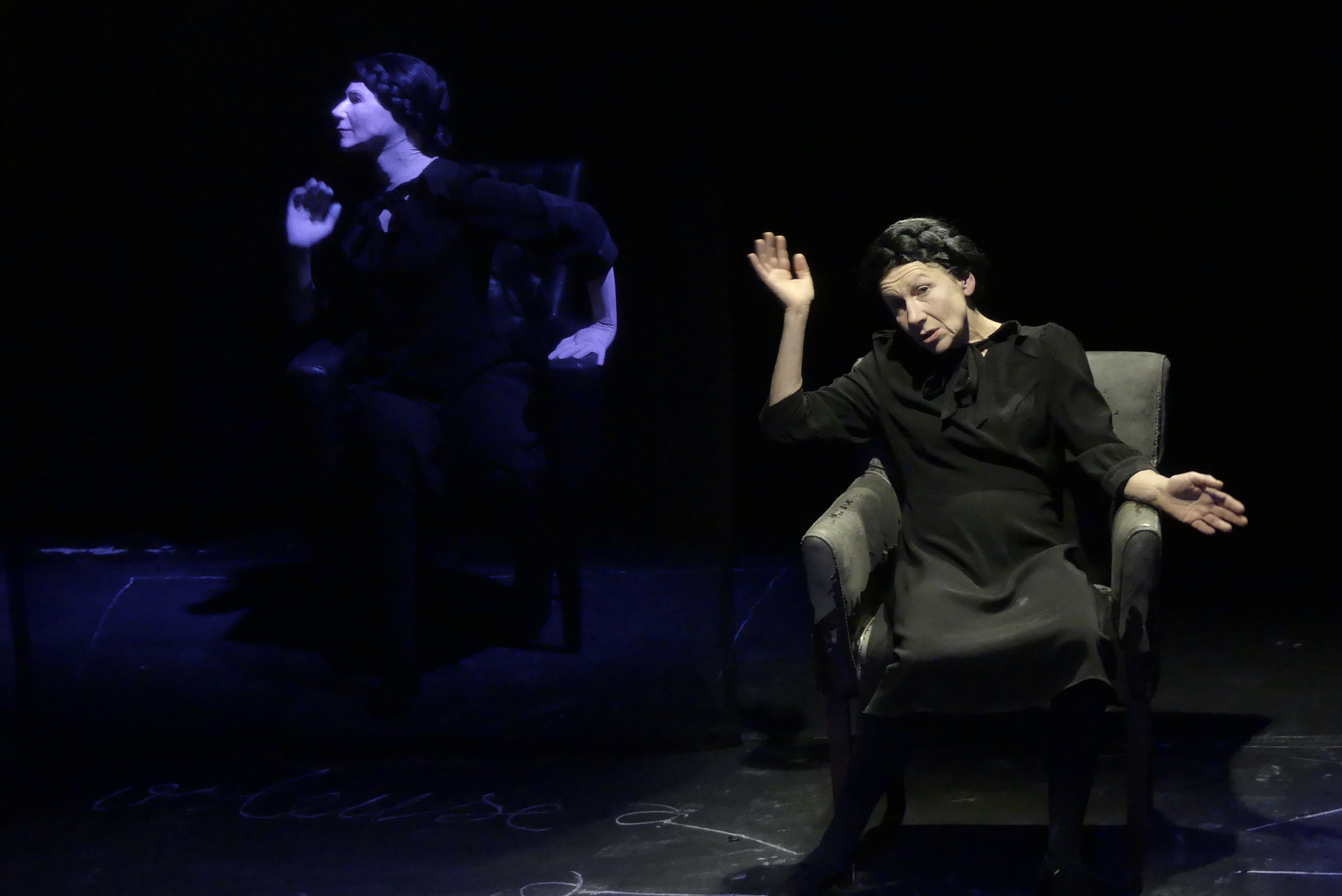 Ce qui aurait pu être un banal accident de la route, un fait divers devient ici un réquisitoire implacable des rapports de classes exprimé par madame Buisson, litanie de préjugés sur la domesticité que représente Ida. La force de cette mise en scène, outre son interprétation, tient à ce qu’elle déplie sans heurt les possibles du récit, la vie d’Ida résumée en commençant par sa fin de quelques traits de craies sur le sol comme on détoure un cadavre. C’est portée sur le dos d’Ida, où que l’on suppose telle, qu’arrive madame Buisson. Image frappante, étrange corps chimérique, animal siamois, qui résume avec acuité la relation ambivalente de ces deux, inséparables par nécessité et séparées par leur condition déterminées. Mais qui est qui des deux ? Puisque on ne les distingue pas l’une de l’autre. Même coiffure, même vêture, même visage. A la raideur bourgeoise de Madame Buisson répond le corps désarticulé d’Ida, pantin de chiffon. Mais entre ces deux-là, la frontière est poreuse, « je suis Ida ou je suis madame Buisson », Laurent Michelin ne tranche pas et, avec doigté et raison, entretient le flou, celui-là même qu’entretenait Hélène Bessette, point nodal d’une folie, le délire d’Ida, qui tel un mascaret gagne lentement chacune. L’une étant l’objet de l’autre, subtil jeu de dupe, Madame Buisson manipule Ida avant d’être à son tour manipulée dans un rapport de domination qui ne cesse de s’inverser. Manipulé au sens propre comme au figuré… Le délire d’Ida atteint madame Buisson par son absence brutale, n’ayant plus l’objet-Ida sous la main qui justifiait son emprise.