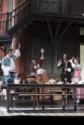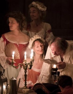 On est dans une grande pièce commune d’une maison d’époque, où les comédiens entrent et sortent par différentes portes, ôtent leurs costumes de scène, se démaquillent, débattent autour d’une grande table en bois, chargée de quelques objets et victuailles. Souvent dans une large obscurité et un éclairage à la bougie, on s’invective, on rit, on se réjouit du succès des mois écoulés apportant des recettes inégalées et inespérées. On boit en fond de plateau à jardin où trône une cuisine qui pourrait être celle d’une auberge, on se rend à l’étage pour installer des lampions ou s’interpeller. Tout n’est toujours pas audible car les comédiens au sens propre et dans la méta-théâtralité s’adressent les uns aux autres parfois dos au public, comme dans le quotidien de la vie d’une troupe, dont il s’agit notamment de faire apercevoir le fonctionnement largement démocratique, qui conduit notamment à voter en assemblée afin de décider du sort de chacun, aussi bien pour discuter des projets matériels (tels la sécurité du théâtre), des distributions, des salaires que des programmations (faut-il faire une série avec L’École des femmes ?). Ce fonctionnement que l’on retrouve en partie dans l’institution actuelle de la Comédie-Française, ne donne à personne le premier rôle, notamment pas Jean-Baptiste Poquelin, un fringuant Molière une décennie avant sa disparition, dans le jeu de Clément Bresson. Aucune fausse note dans cette distribution, notamment féminine. Florence Viala et Adeline d’Hermy sont délicieuses chacune à leur manière dans les rôles de Madeleine et d’Armande, Elsa Lepoivre est une Mlle du Parc comme on l’imagine idéalement. Les hommes excellent aussi dans leurs personnages respectifs, mais on ne peut nier qu’on eut aimé qu’une place plus grande soit faite à Hervé Pierre pour son dernier rôle en tant que sociétaire. Il quittera donc la troupe du Français avec discrétion et modestie, et on n’aura plus que les souvenirs de son fabuleux Peer Gynt pour nous réconforter et le cas échéant la consolation de pouvoir le voir incarner une dernière fois Galilée dans une reprise à l’automne.