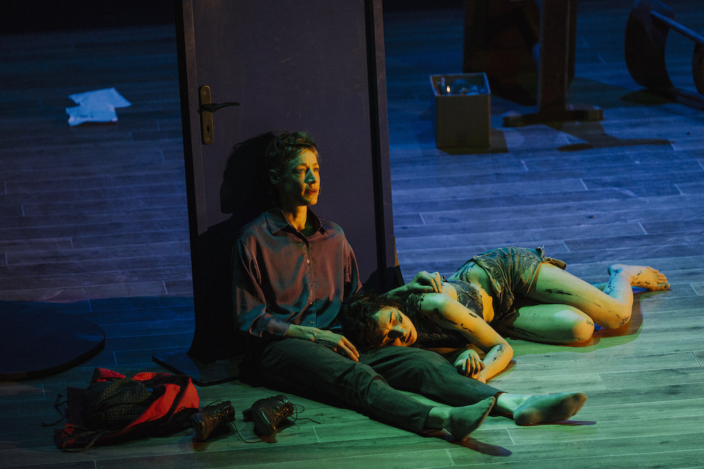 Et puis Jeanne recèle d’autres secrets, chemins d’évasion fantastique, inespérés, tel un marais luxuriant dans une chambre d’hôtel. Promesses d’ailleurs en soi. Les rencontres adviennent dans une pleine et consolante acceptation qui vaut aussi bien pour Jeanne que pour la forme théâtrale qui s’offre à nous. Un vieux promeneur, magnifique et lumineux Yoshi Oida, ouvre une parenthèse (d’ailleurs la nouvelle éthique de Jeanne ne consiste-t-elle pas à l’ouverture infinie de parenthèses dans le rectiligne cours de la vie ?), ce vieil homme partage son thé avec Jeanne sur le banc d’un parc et déclare que « pour inviter il faut de la place en soi ». C’est cette place ainsi nommée que Jeanne ouvre petit à petit en chacun de nous, nous rendant plus sensibles à ce qui s’offre, à chaque instant, sans en rien préjuger, nous délestant d’un trop plein d’attentes ou de narrations dont le monde nous charge ad nauseam oblitérant notre profond désir de contemplation et d’écoute. Devant l’immense paroi, semblant construite de toute éternité au fond de la scène, toile bleutée et veinée d’énigmatiques et fascinantes cicatrices pareille à une peinture de Simon Hantaï, ou si l’on préfère à un banc d’étourneaux dans la tombée du jour, Jeanne nous invite à un sublime acquiescement devant les flots d’une vie débordant sous nos yeux de son cours. Enveloppé par les mélopées de Demi-Mondaine, faisons ce pari pascalien sur les rives du fleuve héraclitéen.