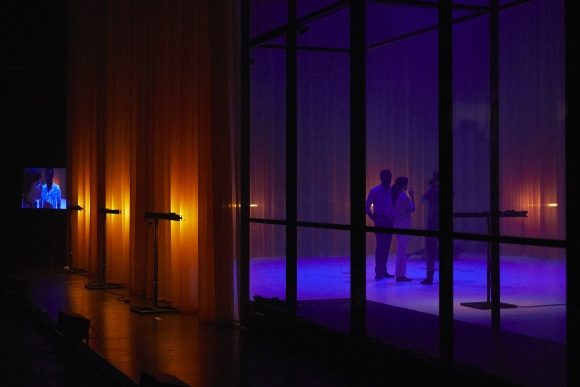 On retrouve ici des thématiques et des esthétiques chères au talentueux metteur en scène, adulé voici quelques années par le public avignonnais. Des écrans modulables, du cinéma-théâtre tourné en temps réel, un décor imposant, une bande sonore qui gronde et qui perce les tympans. Une esthétique du spectaculaire percutante, comme aussi bien intimiste par le cadrage qu’au cinéma. Un va et vient entre théâtre et photographie (qui est de toute beauté) dont Gosselin aime saisir toutes les possibilités et maîtrise toutes les limites.