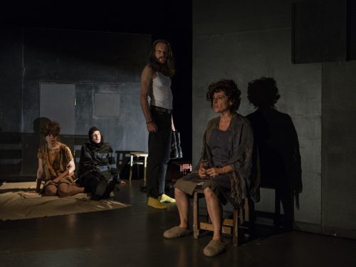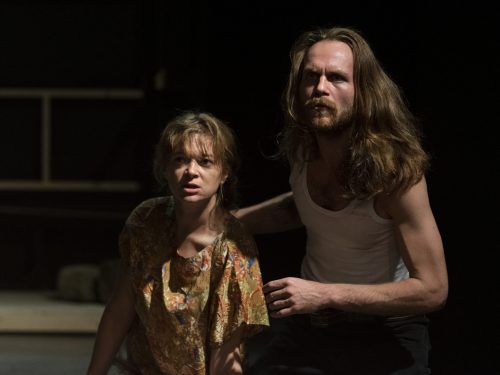 Régis Hebette signe à la fois l’adaptation et la mise en scène de cette tragi-comédie. Un côté expressionniste, onirique même, dans la scénographie, lumières entre chien et loup, crépusculaire, neige en abondance, jeu d’ombres qui découpent, agrandissent les silhouettes, et surtout un décor mouvant, paravents noirs découpés et coulissants, manipulés à vue, labyrinthe menaçant se faisant, se défaisant, qui enferment bientôt K dans ce village et n’offrent bientôt plus d’issue. Une mise en scène fluide, mais où le temps semble comme aboli, étouffé par le rythme donné volontairement étal. Quelque chose semble stagner là qui participe de la condition de K, le seul pourtant dans ce cauchemar, à s’agiter avant de se fracasser devant la force d’inertie des villageois et des fonctionnaires. Régis Hebette efface ainsi tout repère de temps et d’espace, le village semblant être englouti dans le néant et les ténèbres, assujetti au Château. De même ne s’embarrasse-t-il de rien. Peu d’accessoires, réduits à l’essentiel et de brics et de brocs, juste pour signifier, c’est tout. Ce qui prévaut c’est le texte et la silhouette de chacun des personnages dessinée par les comédiens, dirigés au cordeau. A l’exception de Ghislain Decléty, L’arpenteur K, – parfait dans son obstination et son incompréhension d’un système qui le broie – ils donnent corps (au sens premier du terme) et relief, habiles aux changements, entre réalisme et burlesque, aux multiples personnages (39, quand même !) dont ils ont la charge. Se dégage une drôle d’atmosphère, étrange, voire étouffante que réhausse une création sonore anxiogène. Régis Hebette ne donne pas de clef, n’assigne pas un sens unique à cette œuvre qui se révèle d’elle-même par cette atmosphère dans laquelle il la plonge et qui infuse le plateau et la salle. Une œuvre prémonitoire pour son époque et qui prend aujourd’hui une étrange et sale acuité. Histoire d’une impossible résistance, d’une résignation devant des forces obscures dominantes, d’une soumission obligée au système et ses conséquences. Et si le refus de la soumission existe, incarné par le personnage d’Amalia, c’est au risque assumé d’en payer le prix, être au ban de la société, devenir paria. Ce qui est au cœur de l’œuvre de Kafka et de cette mise en scène.