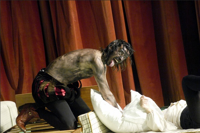 Aussitôt éloigné de ceux qui décalent leurs chaises pour ne pas être trop proches du sulfureux personnage, Kean, « s’annonce » en scène. Voilà le comédien de génie, vêtu de sous-vêtements et jupe en jeans entonnant le rock’n roll des années 70. Celui-là même qui, ivre enchaîne bouteilles de champagne et narguilé et déclame Othello. Kean, le personnage révolutionnaire, acclamé sur scène et décrié au-dehors. Kean, celui qui investit Hamlet et Richard III. Frank Castorf trouve en Alexander Scheer celui qui donne au personnage la juste mesure de l’excessif.