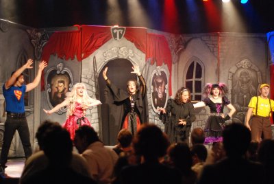 Les chansons pleines de rythmes aux refrains très présents composées par Fred Colas, également comédien dans ce spectacle, entraînent le public. (Chansons qui font un tabac à la sortie de la salle lors de la vente du CD.) Les comédiens pour être sûrs d’obtenir la totale adhésion des spectateurs marquent la cadence : tapage des mains ! Puis le jeu, très inspiré de la culture télé de nos charmants bambins accros aux écrans, démarre : 4 candidats, juste ce qu’il faut de caricatural, débarquent sur scène appelés par la sombre, sardonique et sexy animatrice Malicia.
