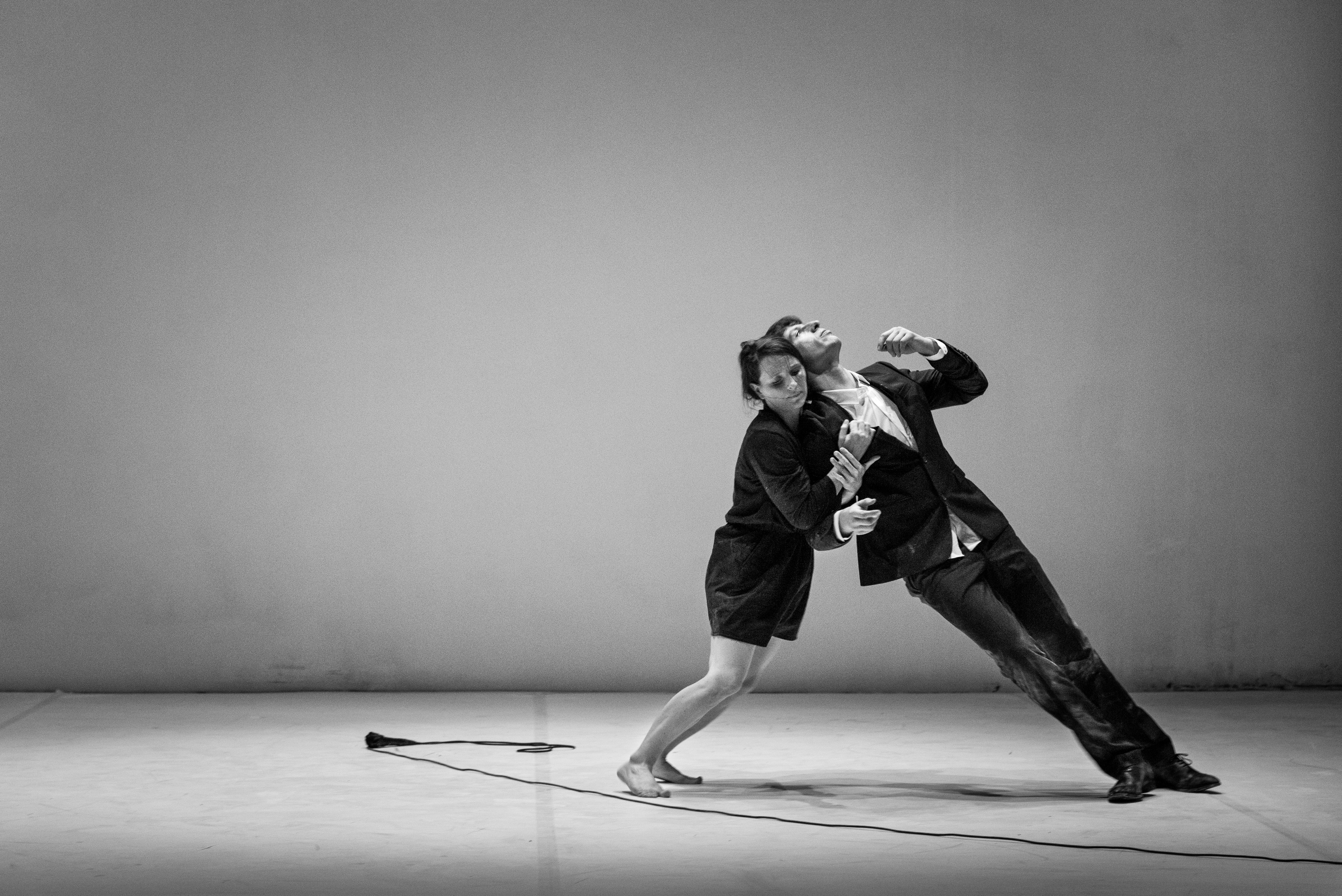 Une musique s’installe en même temps que le public, des notes répétitives et légèrement agressives. Inaudibles aussi. On grogne un peu, façon « encore ! » mais ce décor blanc appelle tout de même à certaine paix, un calme pourquoi pas. Et voici qu’une de ces belles parois blanches, côté cour, se met à vibrer, plus que ça même, une jambe le transperce, puis une autre, enfin le corps immense et fin de Blaï Mateu Trias, à qui elles appartiennent, forcément, oui. Un personnage fort sobre, costume noir et chemise blanche. Il se promène, discute, surprend déjà et sur le même mur blanc, à nouveau d’autres vibrations, un autre pied, un peu plus loin, et de la même façon un autre corps, celui d’une femme − en vrai Camille Decourtye − en jolie robe noire, les cheveux bruns sur le visage, un instant seulement, puis visage pour de vrai. Surprise, étonnement, accueil. Et là, tout simplement, se met en place, comment dire ? entre danse, clowns légers, pie-corbeau incroyable (un vrai, qui s’appelle Gus, connaissant parfaitement son texte, oui, sûr de lui et sachant saluer, quand il le faudra) ou, soyons fous, théâtre, une histoire d’amour ? Le début, les premiers étonnements, les bagarres pour quelque chose, pour rien. Les joies silencieuses et répétées, l’union, la vraie, celle qui fonctionne même lorsque tout semble bien compliqué, voire dangereux. Et toutes les traces que cela laisse, fines et belles, traces sur les murs, traces sur le corps, vous verrez. Gus vérifie, regarde, juge sans trop rien dire. Souvent les animaux participent au travail de cette compagnie dont on sent la patience, l’attention. Éblouissement.