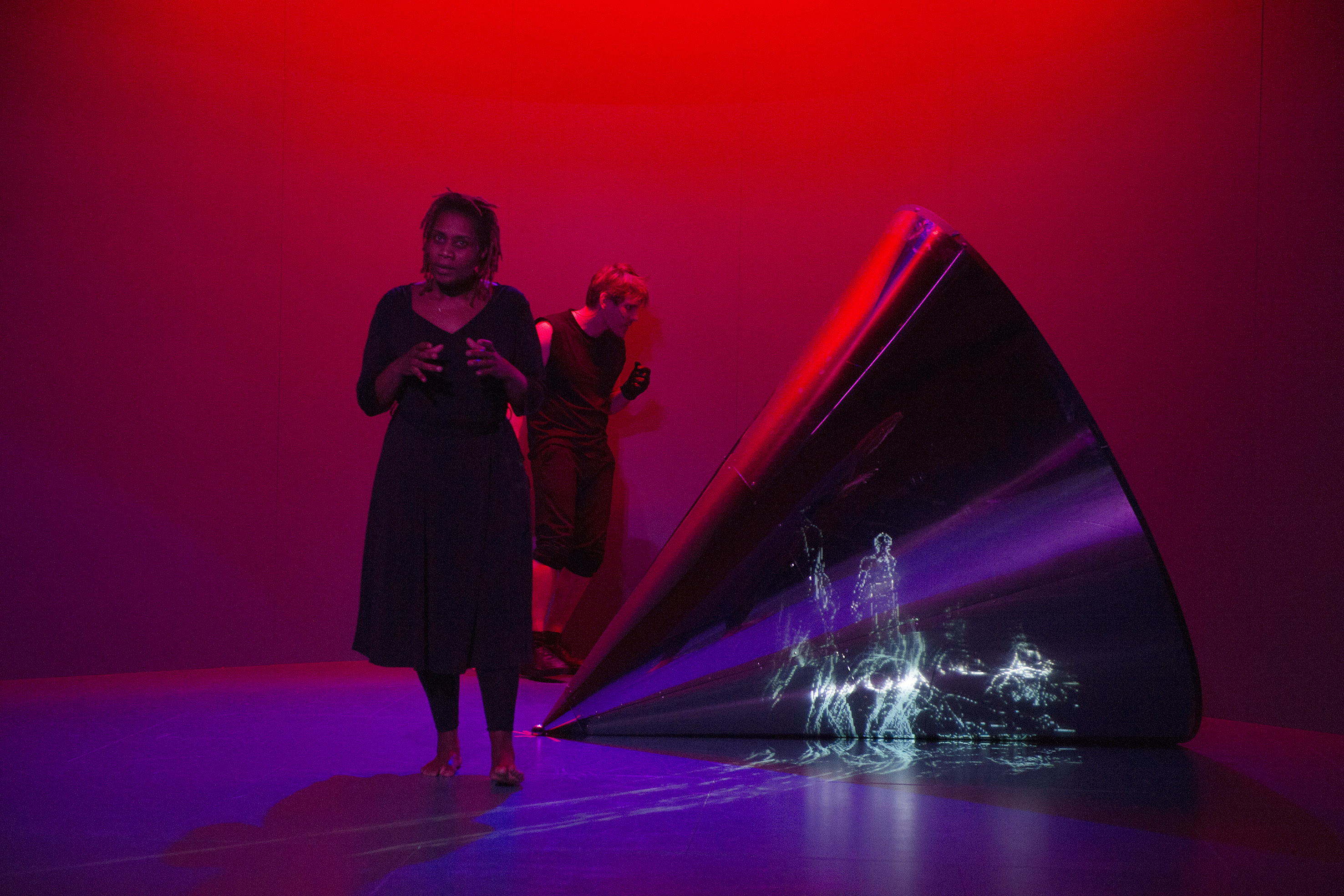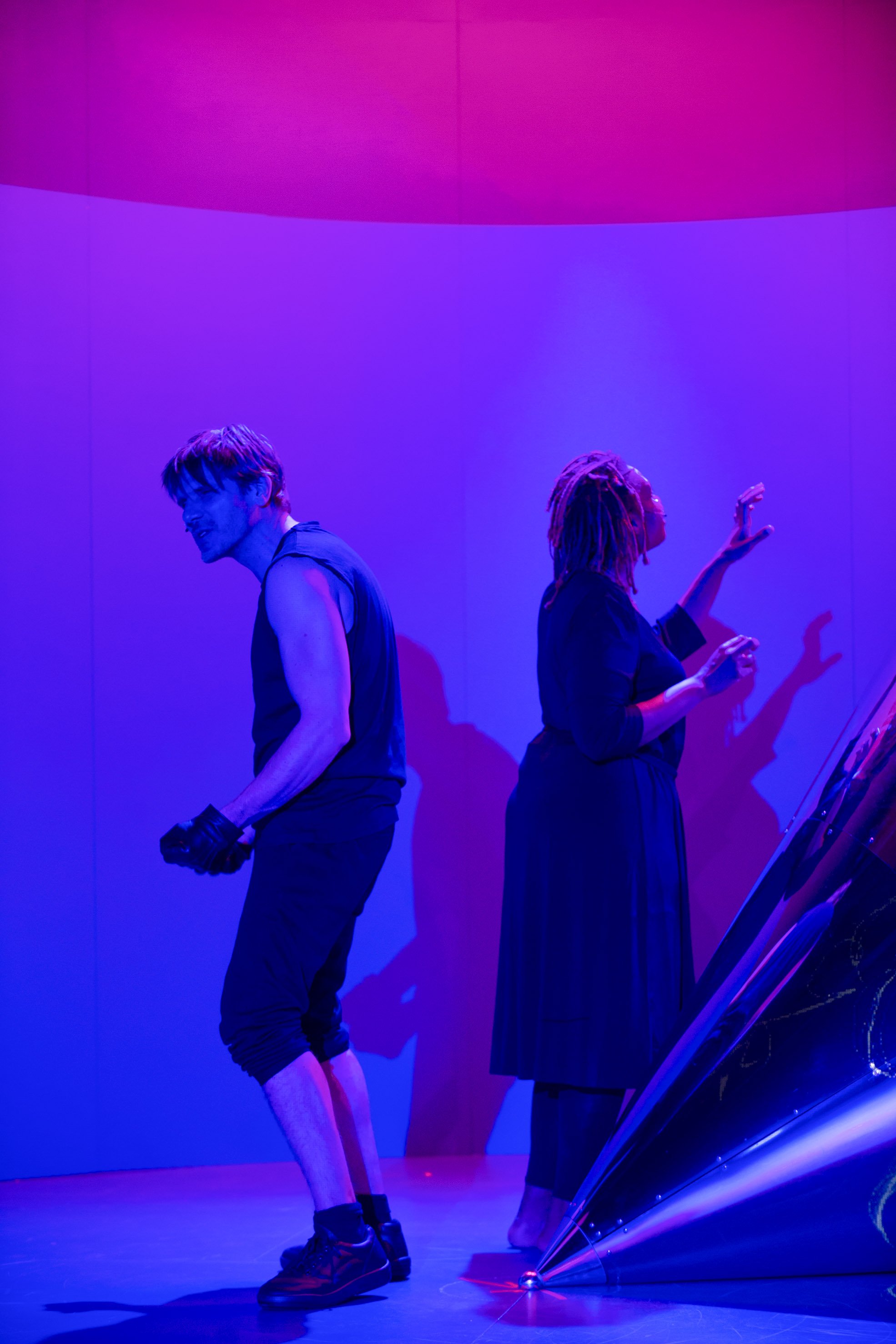 Ils sont deux sur le plateau qui jamais ne se croisent, épousent lentement, et à rebours l’un de l’autre, la courbe de cette boîte qui les enferme, au centre de laquelle un cylindre conique et métallique anamorphose leur silhouette et découpe l’espace, sépare de fait, quand elle ne les occulte pas, les deux récitants. C’est tout à la fois un espace mental et la métaphore de ce récit qui ne cesse de se dérouler au rythme de cette chasse et de se métamorphoser au fur et à mesure des questions posées et dont les réponses, les résolutions gardent à la fois leur énigme et leur cruauté. Ce que Julia Vidit réussit également c’est de créer une atmosphère, des états émotionnels, détachés de ce qui est proféré pour en faire en quelque sorte la synthèse. Et de cet opus faire un objet théâtral et plastique traduisant au mieux, au plus près, l’écriture, l’expérience d’une lecture et d’une pensée et de son ressenti. Et tenter de révéler le sens profond de l’œuvre choisie. Tout concoure ici à cette réalisation d’une œuvre qui se voudrait totale et inclusive, son, lumières, images et reflets… Étienne Guiol, dessinateur et vidéaste, et Martin Poncet au son, ajoutent à cette expérience particulière, visuelle et sonore.