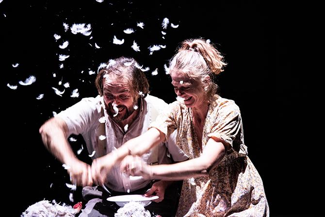Job interprété par Filippo Dini avec une grande sensibilité, faillit une seule fois à ses convictions en acceptant de renvoyer le garçon boucher qu’il considère comme son fils. A partir de ce moment, le personnage voit son âme déchirée par la douleur et le remords. Ce n’est qu’à la mort de sa femme –  jouée avec une grande douceur par Monica Samassa – que Job se sentira apaisé grâce à la fulgurance de sa foi en Dieu. Cette foi, à ce moment tragique de son existence, est totalement incompréhensible pour le fils – Fausto Paravidino – qui ne croit plus qu’en l’argent et la chrématistique.