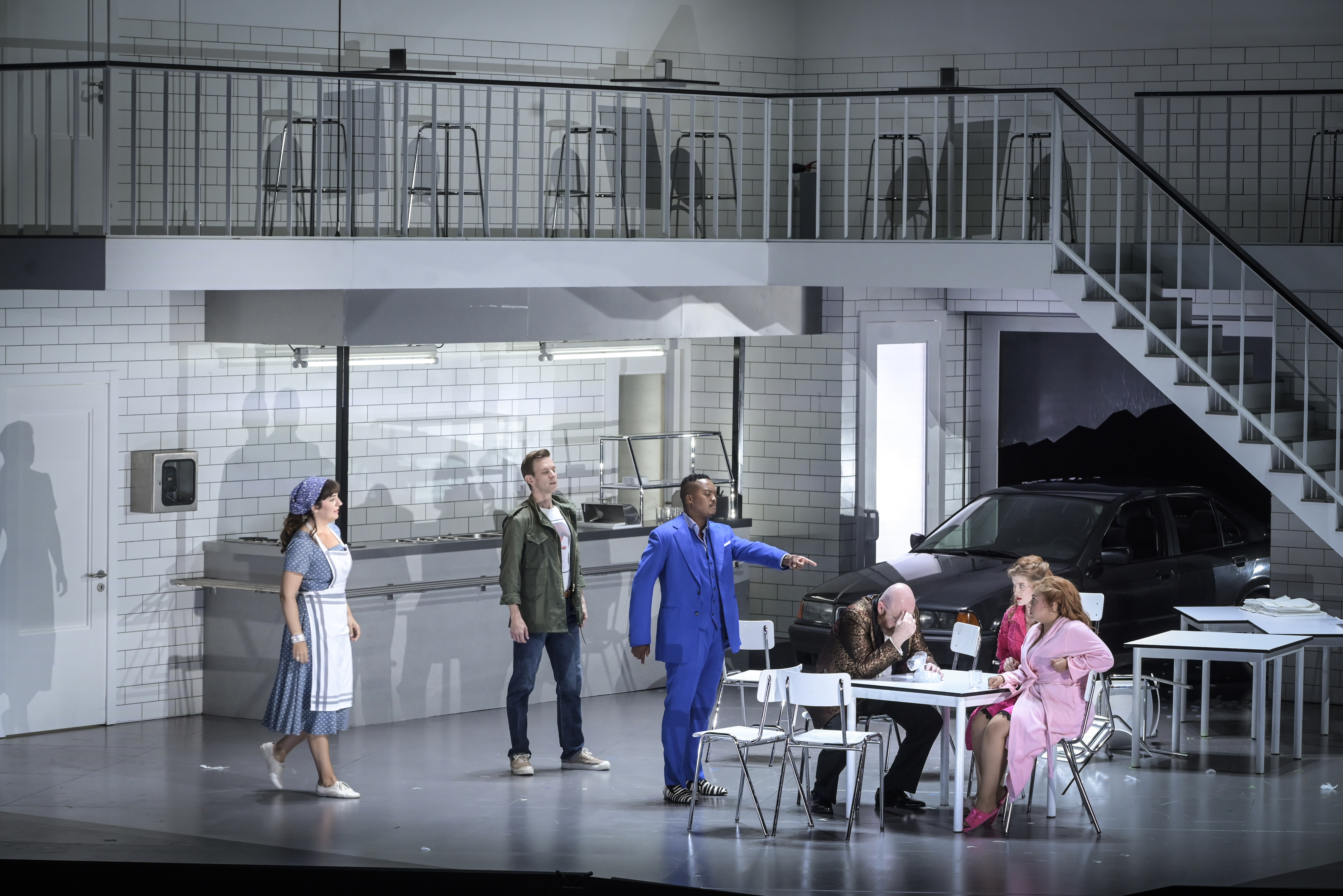Oubliez citrouilles, souriceaux, mésanges et pantoufles de verre (ou de vair, au choix), oubliez la fée marraine. La Cenerentola de Rossini n’est pas un conte de fée au sens ordinaire puisque point de magie ici. Enfin, quand même un peu au vu du destin de Cendrillon qui de souillon dans l’âtre épouse le prince charmant au grand dam de ces deux méchantes demi-sœurs et de son beau-père, puisqu’ici nulle marâtre mais un veuf acariâtre. La mise en scène de Damiano Michieletto ne bouleversera pas les codes du genre. Somme toute classique malgré sa temporalité contemporaine. On passe d’une cafétéria immaculée (et pour cause !) où Cendrillon, bonne à tout faire, nettoie, balaye, range, dessert les tables et sert ses deux demi-sœurs teigneuse comme pas deux, se fait battre comme plâtre par son beau-père, au salon très design d’un palais ou d’une villa chic. Le prince n’a pas de carrosse mais une voiture qui, au passage, entre avec fracas et se crashe sur le plateau. Entrée spectaculaire et peu protocolaire mais effet garanti ! Tout ça est fluide, vif, pimpant et coloré, va « allegro con brio » jusqu’à son terme et se laisse regarder non sans déplaisir. Damiano Michieletto synchronise parfois l’orchestre avec l’action sur plateau comme Tati illustrait de façon sonore ses films ajoutant une touche d’humour cocasse. La seule originalité est d’offrir à ce conte (si peu) réaliste qui du noir passe au rose, une part de merveilleux inattendue. Alidoro, le précepteur du prince, est ici un ange gardien. Moitié Clarence Odbody du film de Capra La vie est belle, le coté miteux en moins, moitié Cupidon aux flèches acérées distribuées à tout va, descendu littéralement du ciel il veille avec bienveillance sur le destin de Cendrillon et du prince Ramiro, tire les ficelles des intrigues de cet opéra semi-bouffe. Le dernier tableau est fort drôle, avouons-le, où l’expression laver son linge sale en famille, enfin presque car il n’est pas question ici de linge mais de serpillères, prend un tour grinçant. Si « ma vengeance est le pardon » chante Cendrillon, bel euphémisme et étrange façon de faire que d’obliger ses sœurs son beau-père et même le chœur à récurer à leur tour le sol. Un chœur qui ne pantoufle pas dans cette production mais est attentivement dirigé qui les voit visiblement s’amuser à jouer, travesti le temps du premier acte, les groupies du prince.