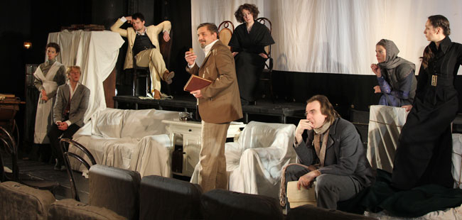 Lev Dodine parvient, par la plus grande des sobriétés, à nous transporter en ce début de siècle. Le temps qui glisse entre nos doigts, la nostalgie du nid familial, les souvenirs prenant possession de la vie devant l’angoisse de la perte et de la mort, autant de sous-textes en filigrane qui sont magistralement orchestrés en petites actions « quotidiennes ». Lioubov embrasse l’imposante bibliothèque des livres de son enfance, les meubles de la maison, recouverts de draps blancs, sont entreposés en bas de la scène comme si, dès le début de la pièce, le domaine était déjà perdu…