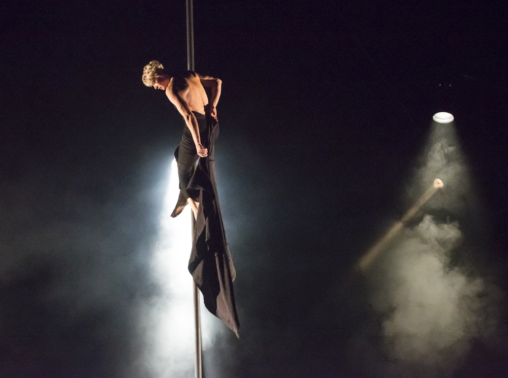 Loin des paillettes et des scintillements multicolores de Noël, le Théâtre du Rond Point nous invite en cette période de fêtes à vivre un véritable rêve éveillé avec La Chute des Anges de Raphaëlle Boitel. Difficile de décrire ce spectacle avec des mots tirés du langage commun, tant il est fantasmagorique et onirique, tant il nous plonge pendant une heure dans un univers chimérique des plus hypnotisants. Mais il nous faut tout de même tenter de vous y donner goût, alors essayons ! D’abord, dire qu’une fois de plus, Raphaëlle Boitel nous étonne par une originalité folle, tant dans les chorégraphies qui se déploient sous nos yeux que dans les agrès circassiens utilisés, même les lumières sont travaillées de telle sorte que