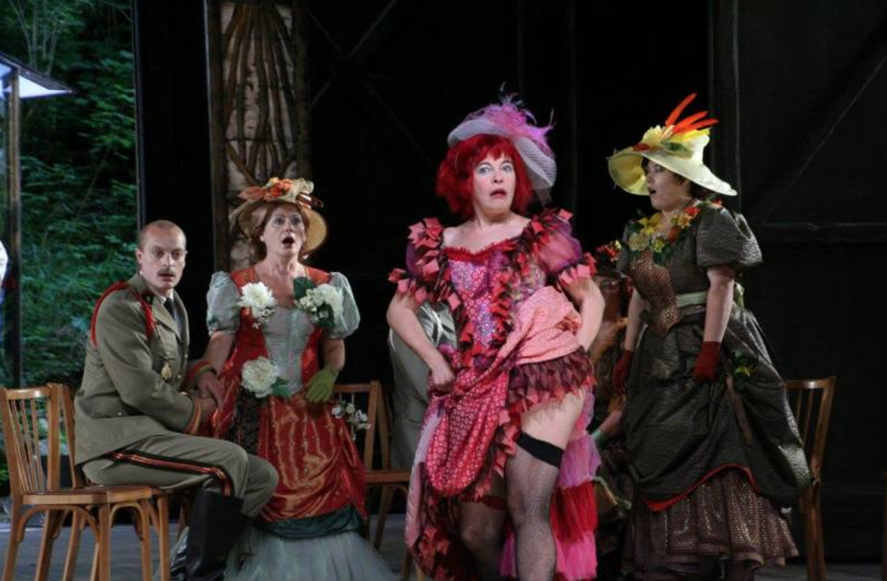 Pour sa dernière saison au théâtre de Bussang, le metteur en scène Vincent Goethals a privilégié les retrouvailles. Ils sont venus, ils sont presque tous là, les acteurs emblématiques qui l’ont accompagné au fil des cinq saisons passé à la direction du Théâtre du Peuple de Bussang. Pour ceux qui virent L’Opéra de quat’sous il y a deux ans, retrouver cette équipe, Valérie Dablemont dans le rôle-titre de la Môme Crevette en tête et Mélanie Moussey en madame Petypon, dans un vaudeville survitaminé est un vrai plaisir. Amateurs et professionnels, on ne voit guère la différence au vu du talent des uns et des autres, d’un même élan généreux traversent le plateau au pas de course. Vincent Goethals pour faire un peu de place à tous, ménageant des apparitions parfois fugaces, n’hésite pas même à broder, à tisser finement et solidement un patchwork où surgissent soudainement des personnages d’autres pièces de Feydeau qui se glissent ici et là, se télescopent, sans que cela ne nous étonne plus que ça. Ainsi voit-on passer Lucette Gauthier, Fontanet et le général Irrigua du Fil à la patte, Dufausset de Chat en poche et d’autres encore invités surprises. Mieux même, clin d’œil malicieux évident, Brecht s’invite sans crier gare dans la chambre des Petypon… Avec ça et en prime Vincent Goethals fait chanter à tout ce petit monde déchainé du Offenbach, airs connus ou inconnus qui se glissent sans souci et le plus naturellement du monde entre deux répliques. Et chanté avec justesse ! Offenbach et Feydeau ne se sont jamais rencontrés, ne pouvaient se rencontrer, objecterons-nous, qu’importe ça marche du feu de dieu. Et en parlant de feu, cette mise en scène est explosive. Valérie Dablemeont, rousse flamboyante ici pour ce faire, ne brûle pas les planches, elle les calcine, pétarade tout feu tout flamme, et entraîne tout ce petit monde dans un galop effréné. Pas de temps mort, pas le temps de respirer. Vincent Goethals privilégie le rythme, infernal. Valérie Dablemont joue de la voix, entre l’oseille et le contralto, tricote des jambes qu’elle lève haut et mène cette sarabande superbement grotesque et pathétique tambour battant. Et tous, nul n’est en reste, de suivre cahin-caha et sans faiblir ce rythme endiablé… Sur ce plateau il y a de la joie, de la folie furieuse, du bonheur, c’est évident, ça se voit, ça se joue et chante. Vincent Goethals s’amuse lui aussi. Entre autre à rétrécir le théâtre, le miniaturiser. La chambre des Petypon est métamorphosée, c’est une maquette du Théâtre du Peuple tout riquiqui où le lit, objet du délit, trône sur un plateau, encadré du même manteau d’arlequin qui bordure la scène. La vie conjugale est un théâtre, Feydeau ne le contredit pas, Vincent Goethals le confirme. Subtile mise en abyme aussi, hommage à ce théâtre qui cinq années durant aura suffi à son bonheur et au nôtre. Cette étroitesse volontaire du lieu, relative, qui oblige à jouer en avant-scène, offre une proximité immédiate avec les spectateurs, nous reviendrons vers eux, et concentre la folie de ce vaudeville, rapproche dangereusement les corps qui jouent au quatre coins, se cherchent et s’évitent, se heurtent aussi, dans cet espace clos de portes battantes qui claquent sèches comme des gifles, exacerbant les tensions et les situations, alimentant les quiproquos et les mensonges. Feydeau c’est toujours une histoire de circulation chaotique des corps. De vitesse. Mais quand enfin l’espace s’ouvre à l’acte deux sur la clairière qui fait office de fond de scène, c’est toute la beauté du lieu, de ce théâtre qui retrouve sa pleine dimension exceptionnelle. La pièce elle-même est comme aérée, momentanément, Vincent Goethals jouant avec justesse avec les perspectives, en opposition volontaire avec l’acte précédent et de celui qui suivra. Et tant qu’à faire, terminer cet acte deux dans le public hilare. Les personnages eux-mêmes respirent et les corps n’ont plus de contrainte, s’échappent provisoirement. Une liberté source encore une fois d’explosion et de folie générale. Dans la salle, le public fait un aaaah de ravissement devant ces portes ouvertes, attendues comme le clou du spectacle, avant de nouveau hoqueter de rire. Car la salle est heureuse ici, hurle de rire, tape des mains et des pieds. Ne boude pas son plaisir. Cette Dame de chez Maxim…ou presque ! –tout est dans le presque- est une vraie réussite autant par la mise en scène, au cordeau, sans chichis, fluide et réussie, que ce qu’elle procure, dans ce lieu précisément où règne entre le public et la scène une osmose, un bonheur évident d’être là, ensemble pour un moment de vrai et rare partage … Vincent Goethals ne s’y est pas trompé en proposant une pièce populaire, adaptée et mise en scène –et en voix- avec la même exigence qui le caractérise, avec une troupe, il faut le dire, heureuse d’être là, sur ce plateau, dans ce théâtre à l’histoire si singulière. Et comme le dit si bien la Môme Crevette, et en chœur le public à l’entracte, autour d’une tarte au myrtille et de vin blanc, « et allez donc c’est pas mon père ! »