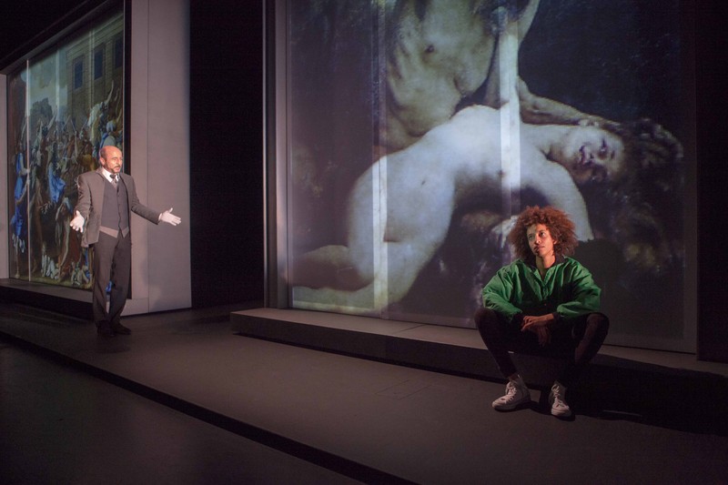 Le décor simple, bâtit avec trois panneaux modulables, donnent à voir des intérieurs sans équivoque ; mur végétal, vue en plongée de milliers de buildings « made in New York », salon anguleux, aseptisé, froid… tout respire l’ambiance « Lounge » et dépourvue de vie des hôtels 5 étoiles et du standing des appartements du Pouvoir. Deux panneaux obliques projettent des scènes picturales entre les actes ; servitude et asservissement des sujets face à leurs maitres.