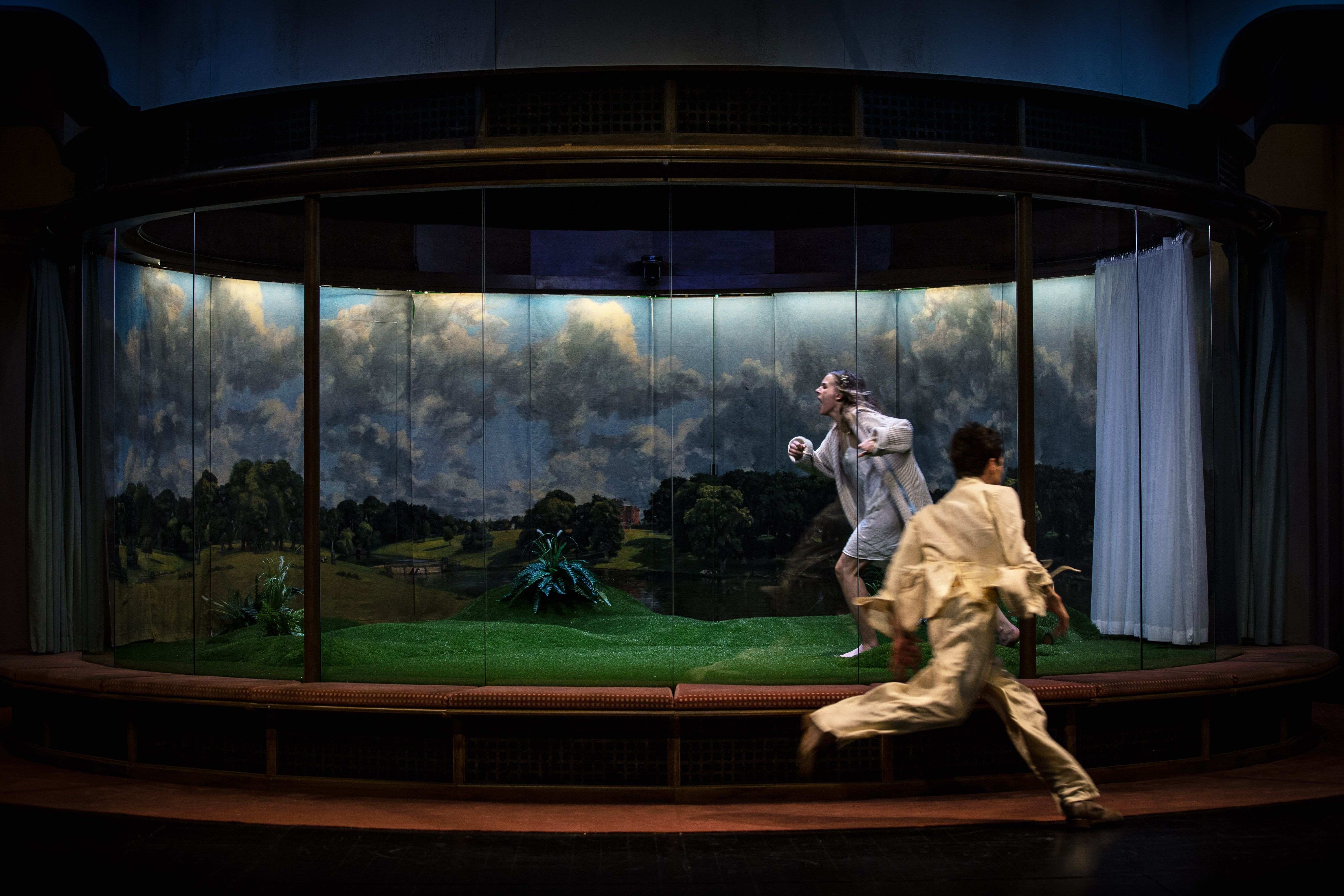 Voilà pour le texte, magnifique et léger, aucun doute, et les rebondissements apparaissent et disparaissent. Le décor porte en son centre une sorte d’aquarium magique, un cercle vitré où l’intérieur peut devenir une jolie chambre à coucher ou tout autre espace particulier, comme des champs entourés de subtiles forêts. Tout autour, ce sont les antres des domestiques, qui malins, ont mis des caméras partout, des micros, et surveillent. Reste la mise en scène alors, surprenante et débordante d’inventivité, avec même un peu de vidéo en direct, puisque s’il n’y en avait pas, ce ne serait pas vraiment du théâtre. Pas de vidéos ? Pas de spectacle. C’est la mode, non ?? Aucune inventivité réelle oui, mais du pep’s amusant. Malgré tout, on s’aperçoit que la voix d’Arlequin a la mauvaise habitude de se dissimuler dans des limbes incertaines ou bien qu’elle a souhaité faire la sieste dans les loges. Les mots sortent mais se fondent ou bien, trop hachés, s’écrasent au sol. Les fourberies, les entourloupes nous emportent tout de même, le rythme est là, les personnages sont forts bien campés. Puis d’autres petits détails qui poussent vers une lassitude certaine. Arlequin est fort mécontent et ne veut pas se laisser faire par les idées du vilain gentil Prince ? Eh bien hop ! un bras d’honneur, vous savez, celui rendu plus joli encore avec l’extase d’un majeur victorieux, dressé bien fortement lui aussi. On est étonné, oui, et on ne voit pas en quoi une petite chose comme ça apporte finesse ou légèreté. Questions plus affirmées après le deuxième joli geste, et enfin vient encore un troisième, cette fois œuvre splendide de Silvia, au cas-où nous aurions raté les deux autres. Jamais deux sans trois, on s’en doutait. Et puis pourquoi pas un petit tour dans une pissotière, où Arlequin discute avec son laquais ? Arlequin n’a pas de chance vraiment, la subtilité oublie de rebondir sur lui, il n’était pas sage pendant les premiers essais de mise en scène ? Sur ces minis détails, les éclats de rire sans doute attendus ne semblent pas multiples dans la salle, ou bien font partie d’une nouvelle tendance, les éclats de rire muets. La double inconstance reste sympathique et bien menée, oui. Seulement un peu trop de pancartes du style « Il y a du moche chez Marivaux » qui souhaiteraient méchamment prendre place.
