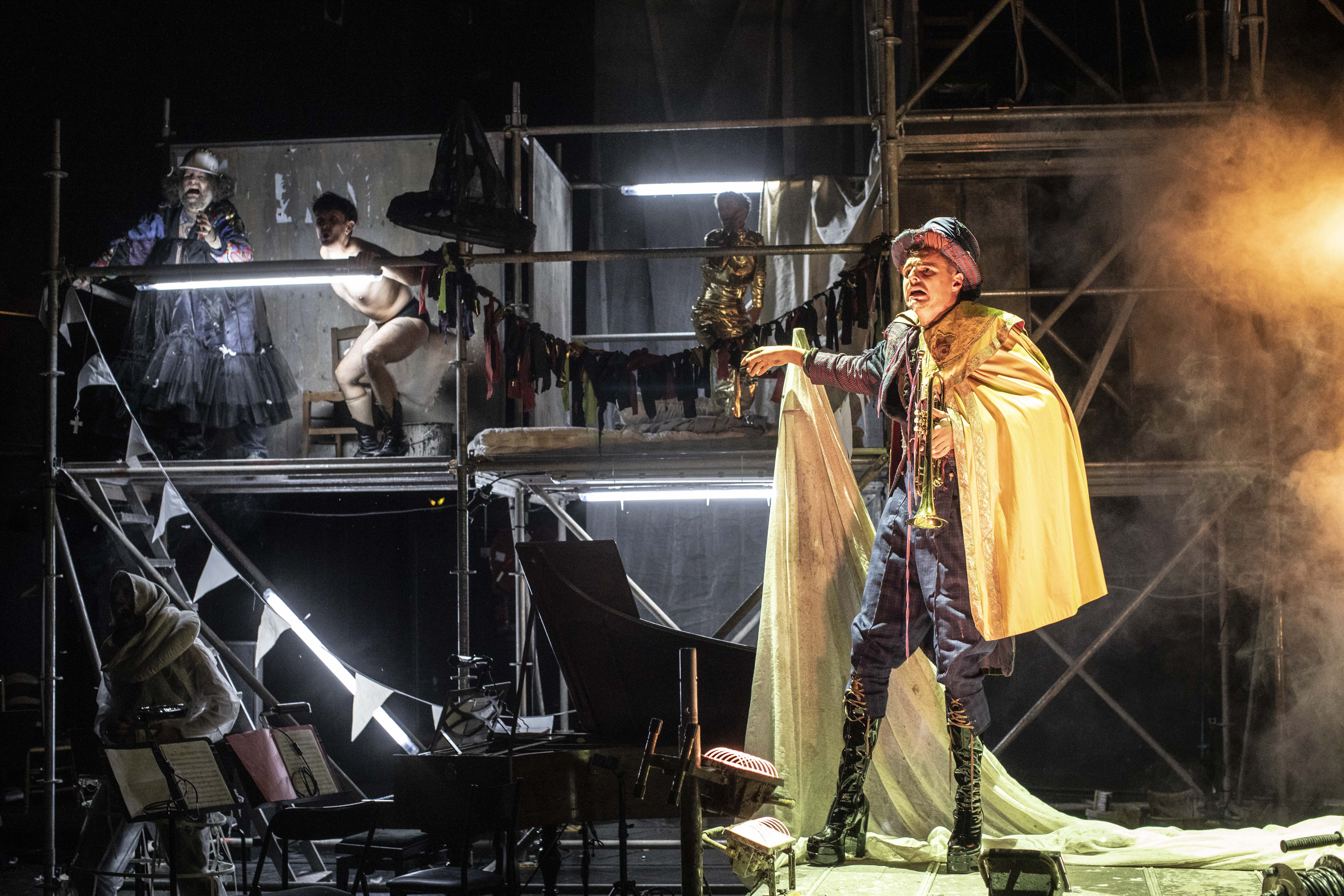 Grande curiosité et l’entrée dans le théâtre est loin d’être récalcitrante, au contraire : échafaudages, colonnes gothiques toutes neuves, ces espaces étranges nous poussent à nous demander comment va prendre vie cet « opéra-spectacle » mis en scène et adapté par Jeanne Desoubeaux, avec une direction musicale de Benjamin d’Aufray et une scénographie, splendide, de Cécile Trémolières. Les costumes d’Alex Constantino sont aussi amoncellement d’époques, de genre. Les youpis ne sont pas loin avec tout cela, joie, bonheur, prospérité presque, au départ.