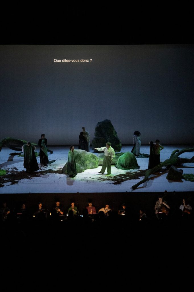 On apprécie dès lors les précautions utilisées par la metteuse en scène Julie Delille en prologue officieux de la Finta Giardinera. D’abord, elle conclut par un facétieux « L’amour parfois c’est compliqué » un résumé des amours contrariées des personnages de l’opéra, projeté au public alors qu’il s’installe dans la salle, dont ils vont être témoins. Ensuite et surtout elle surligne par un jeu silencieux, à jardin, une scène glaçante de violence conjugale et de féminicide (qui s’avérera non fatal), avant que le côté giocoso et léger de la musique de Mozart (dont elle nous avait conseillé de nous laisser porter) ne commence sous la baguette de Chloé Dufresne. En dépit de son énergie, la justesse n’était pas toujours au rendez-vous le soir de première parmi les musiciens de l’Académie (et de divers conservatoires), sachant que les jeunes artistes sont justement dans un cycle de perfectionnement. En revanche, le plateau vocal, à quelques broutilles près, était particulièrement satisfaisant, en particulier la soprane Isobel Anthony, agile et émouvante, bravant toutes les difficultés techniques du rôle de Sandrina, ainsi que la mutine Daria Akulova dans celui d’Arminda et la cabotine Sima Ouahman en Serpetta ; une mention spéciale pour la mezzo-soprane Amandine Portelli, absolument délicieuse dans le rôle de Don Ramiro. Du côté des hommes, le baryton Clemens Franck est superbe dans le rôle de Nardo ; le ténor Yu Shao impeccable dans le podesta et le ténor Bergsvein Toverud offre un étonnant Belfiore.