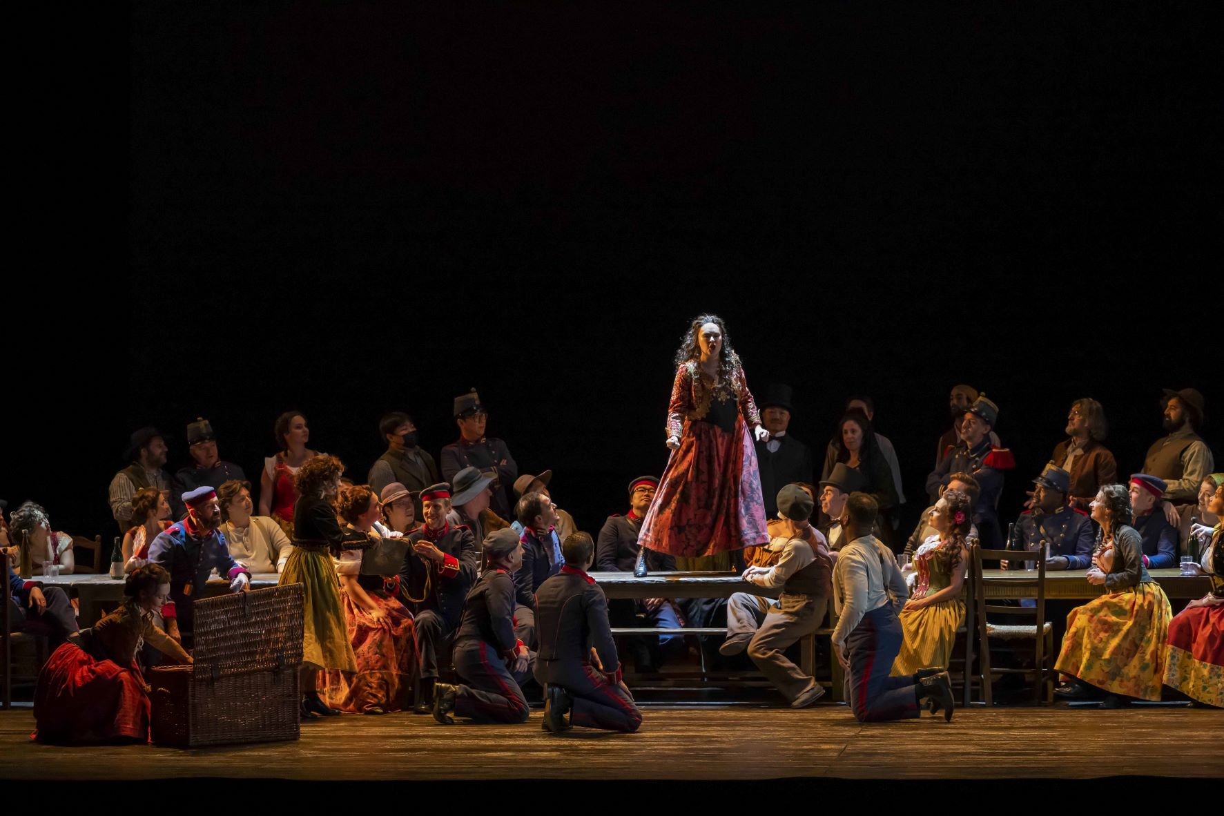 Une fois n’est pas coutume, les chœurs dirigés par Ching-Lien Wu sont radieux dans les seuls airs joyeux de la partition (le banquet-fête ; la soupe populaire) et n’ont jamais été aussi touchants dans les passages plus intérieurs (le chœur des moines par exemple), interagissant idéalement avec l’orchestre (mention spéciale pour la clarinette), sous la baguette de Jader Bignamini.