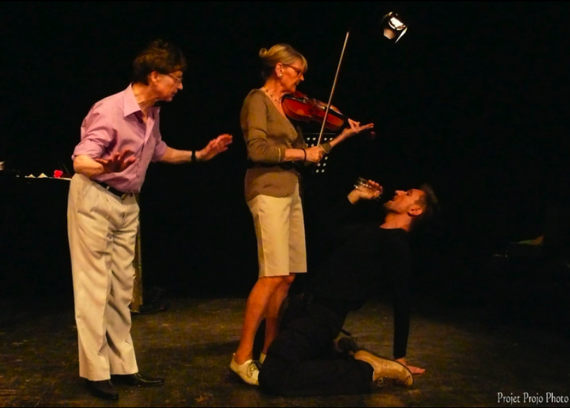 Le pianiste se met en place, il joue sur le piano qui aurait besoin d’un accordeur, il s’énerve sur le piano qui aurait besoin d’un accordeur car la fourchette de Pétula gêne le son, mais ça, il ne le sait pas encore… La violoniste arrive, elle joue. Ils jouent ensemble. Et puis le chanteur rejoint le duo pour parfaire cette dernière répétition avant le lever du rideau. Sauf que cela ne va pas se passer comme prévu : les trois oiseaux vont nous donner à voir de la musique comme on en a peu l’occasion ! La violoniste joue au football avec une partition froissée sur du St Saëns, le chanteur chante du Serge Lama en double appel et le pianiste se laisse emporter par Mika tout en essayant de jouer sa Polonaise de Chopin. Entre-temps, on apprend que la violoniste mène une vie d’internaute en mal d’amour en tant que Petula-du-75, que le pianiste préfère avoir de faux cheveux et que le chanteur obéit aux caprices de sa paire de chaussures. Quel feu d’artifice !