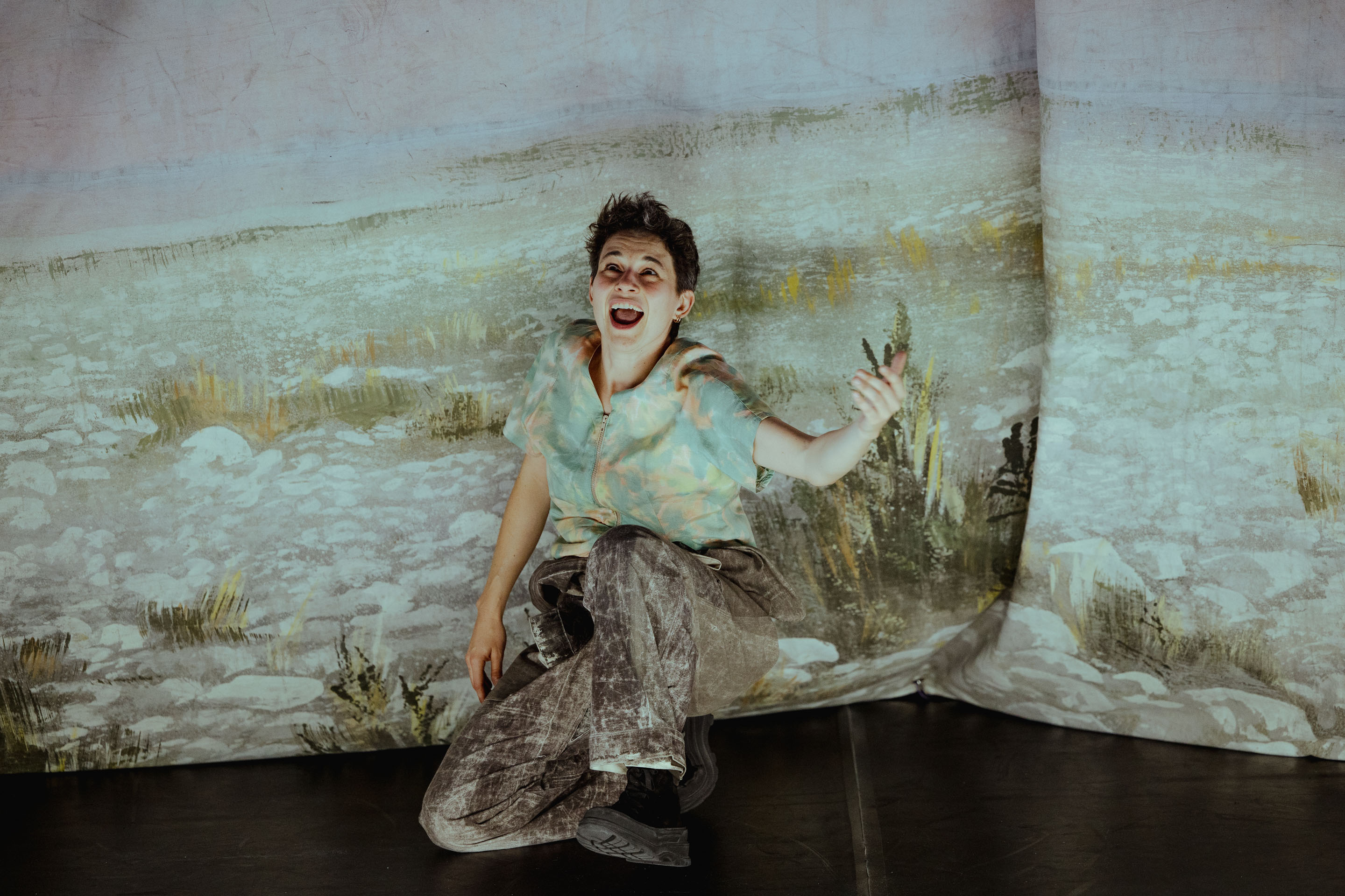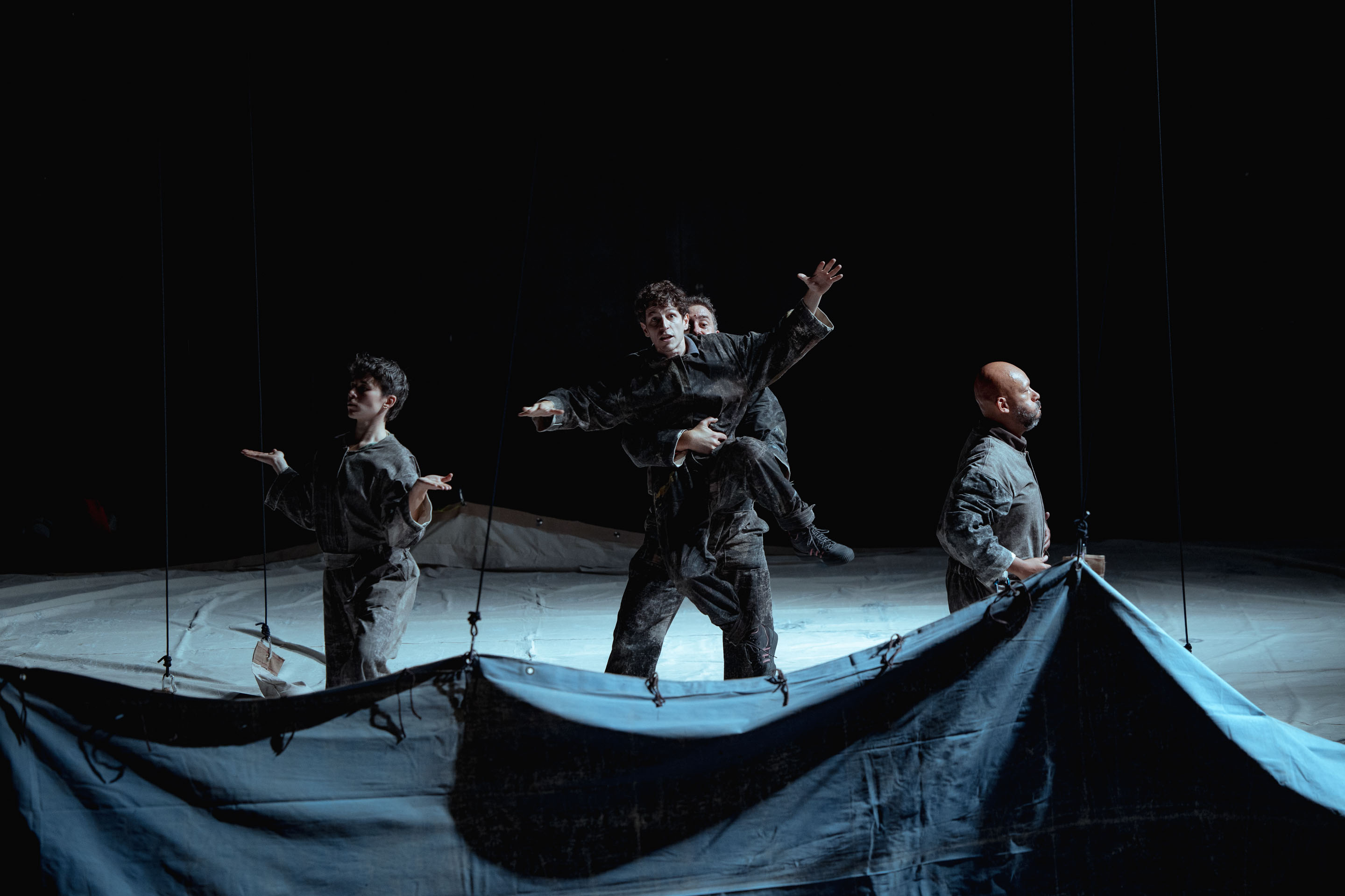 Et pour décor rien que des bâches, toiles peintes d’opéra manipulées à vue. L’espace devient mouvant ; grottes, mers, plaines… magnifique illusion (théâtrale) de profondeurs abyssales, ou d’espaces infinis sans horizon autre que notre imagination, ces toiles déterminent la mise en scène et la dramaturgie, jouant de la dissimulation et de la mise à nu. Plus que les illustrer elles sont dans ses plis et replis la cartographie de ces récits et déterminent leurs enchâssements. Et si on saute allégrement du coq-à-l’âne, propre aux rêves et au théâtre parfois, ces toiles font le lien, le défont, couturent l’ensemble, paysage physique et mental, de mouvements de vagues perpétuelles en concrétions souterraines. Et c’est terriblement beau de par son artisanat volontaire.