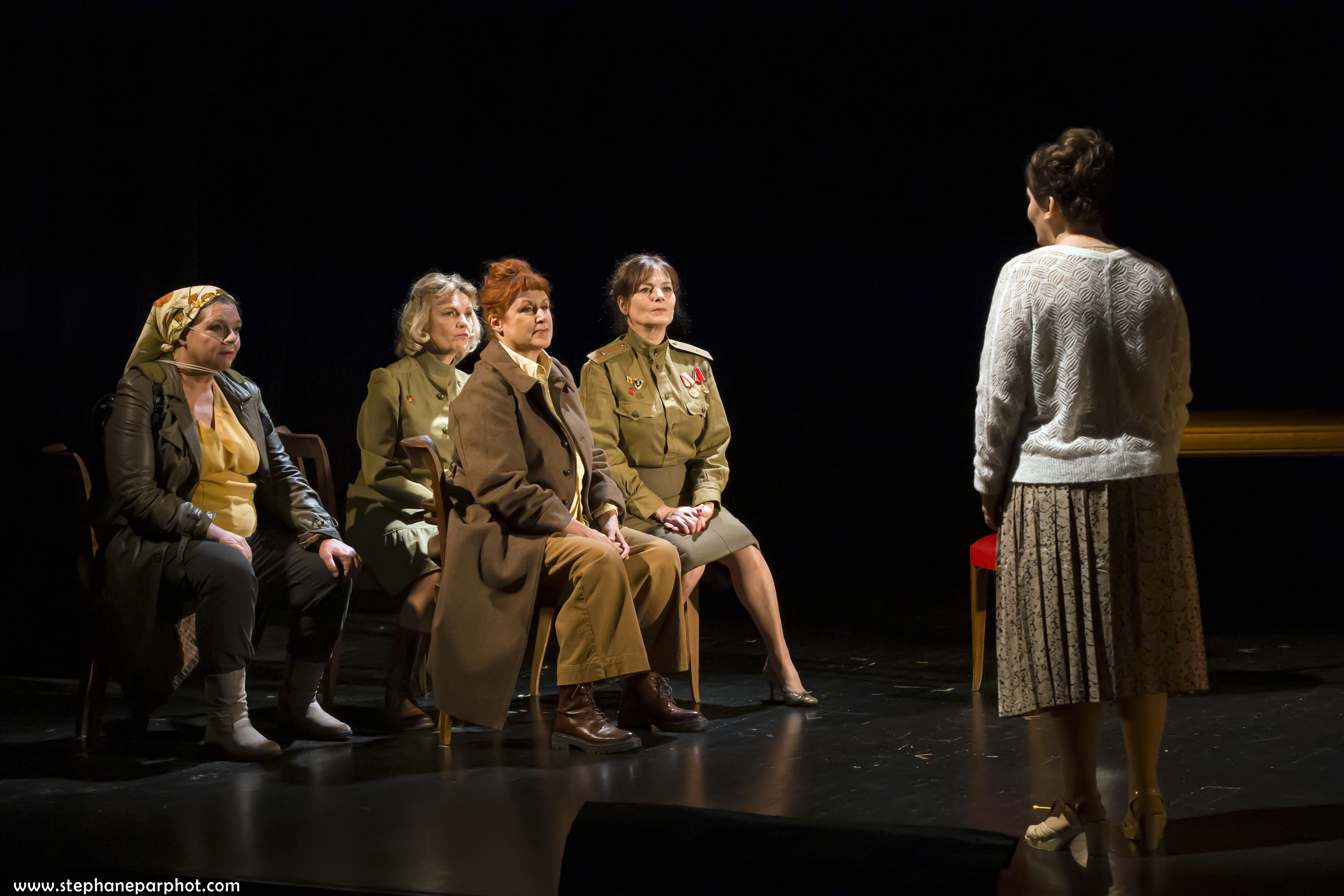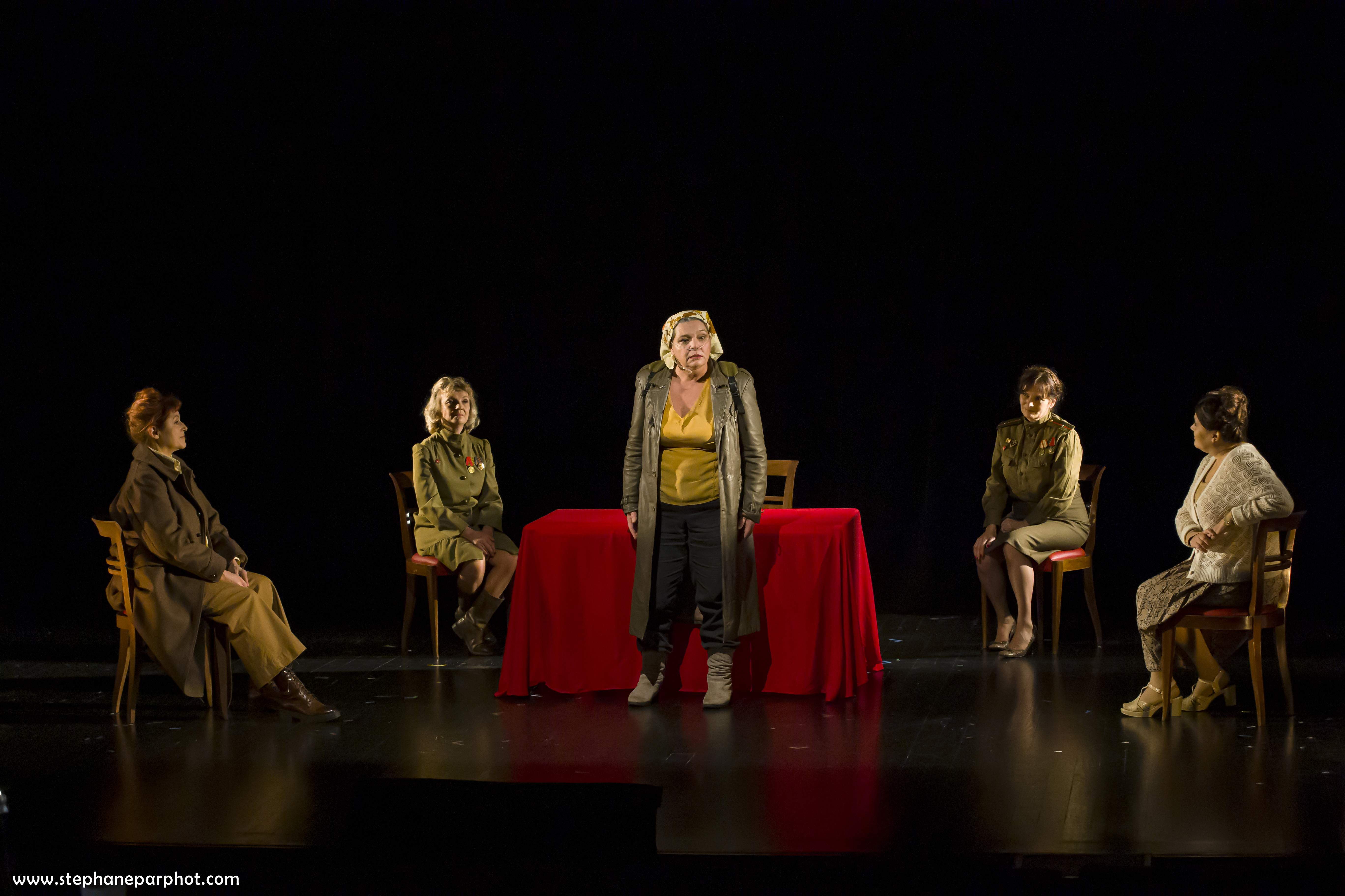 Marion Bierry a resserré les multiples témoignages du récit originel autour de cinq femmes aux fonctions différentes, tireur d’élites, sapeur-mineur, médecin, tankiste, aviateur. La guerre des femmes raconte la petite histoire dans la grande, on broute affamés les parcs lors du blocus de Leningrad, on pratique des amputations avec les dents et tombe amoureux malgré tout, c’est même la seule chose qui permet de survivre, la langue gèle de froid. En corole, par grappes, elles se répondent, parlent le même langage lors de cette conférence imaginaire. Simple, la mise en scène n’en rajoute pas devant la force d’une parole dont on devine qu’elle est prise pour la première fois. Les souvenirs des quatre années de boucherie sont premiers et une question reste en suspens : comment ont-elles fait, ces rescapées pour se remettre à vivre ? On pense à Mesure de nos jours de Charlotte Delbo, revenue d’Auschwitz : « refaire sa vie, quelle expression. J’ai repris mon métier […] je vis en somnambule que rien ne réveillera ». L’indicible, la fraternité des combats, l’amour et la mort à 18 ans, au retour on n’avait plus rien à leur apprendre à ces filles gouailleuses, revêches, douces, pleines d’humour et toujours autant révoltées par la barbarie.