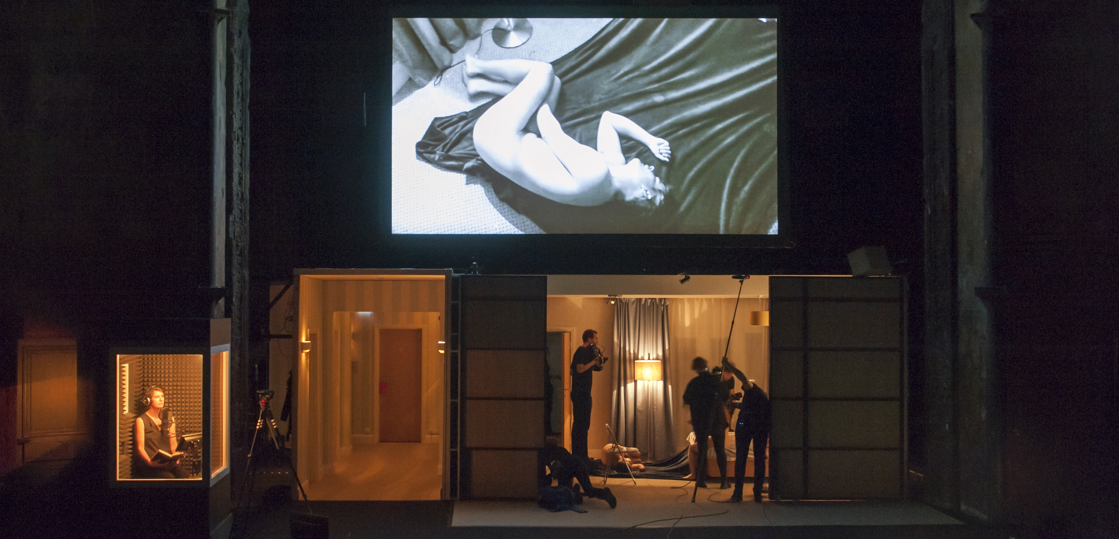 La Maladie de la Mort, performance cinématographique en direct. Ainsi Katie Mitchell conçoit-elle cette adaptation du court récit de Marguerite Duras. Soit une production théâtrale (presque) classique, filmée et montée en direct, film projeté au-dessus de l’espace scénique ainsi transformé en studio. Montage qui associe d’autres scènes tournées en extérieur, créant un hors champs qui chez Marguerite Duras, à l’exception de l’évocation de la mer « noire », n’existe pas. Le plus souvent la caméra prend le relai de la narration, se substitue au texte de M.D. particulièrement pour ce qui est de l’ordre de la description des corps, filmés au plus près, voire presque collée à la peau. Katie Mitchell opte également pour un narrateur extérieur, comme dans le roman, en cabine et visible par nous. Les dialogues sont réduits à peu, cependant fidèles au roman. Mais elle n’hésite pas non plus à créer une enfance au personnage féminin, courte scène traumatique, la découverte de son père pendu, dont on ne voit pas vraiment le rapport et que le roman n’évoque pas. Liberté également prise entre l’évocation par M.D du meurtre de la femme, simple évocation, voire fantasme du personnage masculin, et sa tentative réelle par l’homme. Là Katie Mitchell invente un scénario qui extrapole la véritable relation entre ces deux-là et leur contrat passé, sexuel, pour ajouter une dimension de thriller possible. Le spectateur, lui, pendule entre ce théâtre filmé, en cours de tournage, et sa résolution sur l’écran. Entre un fascinant ballet réglé au millimètre entre acteurs et techniciens et sa résultante. « Le texte serait annulé s’il était dit théâtralement » écrivait M.D dans la postface de son roman. Katie Mitchell prend au mot cette assertion. De ce texte en fait un script. Il n’y a rien en effet de théâtral dans ce qui se joue là, rien dans le jeu des acteurs qui dénoncerait une théâtralité de fait. Performance cinématographique plus que théâtrale donc. Mais au-delà de cet objet performatif, qui l’emporte au final sur le sujet lui-même, ce qui est dommage, malgré les scènes érotiques, crues, conformes peu ou prou au roman, malgré le talent des acteurs totalement engagés, c’est glacial. La chair est triste. Sans âme. Certes la relation sexuelle dans le roman, par le contrat passé, exclue tout sentiment. La maladie de la mort c’est l’impuissance de cet homme à concevoir une relation vraie, émotionnelle ou sexuelle. De même dans cette performance cinématographique où son point de vue là aussi prédomine. Malgré l’incarnation juste et formidablement impudique des acteurs, l’écriture de M.D se refuse à eux. A nous. Ne reste que le sujet. Là aussi sans doute l’écriture de M.D est comme « annulée ». Or c’est elle le véritable sujet, l’incarnation, la chair du roman.
