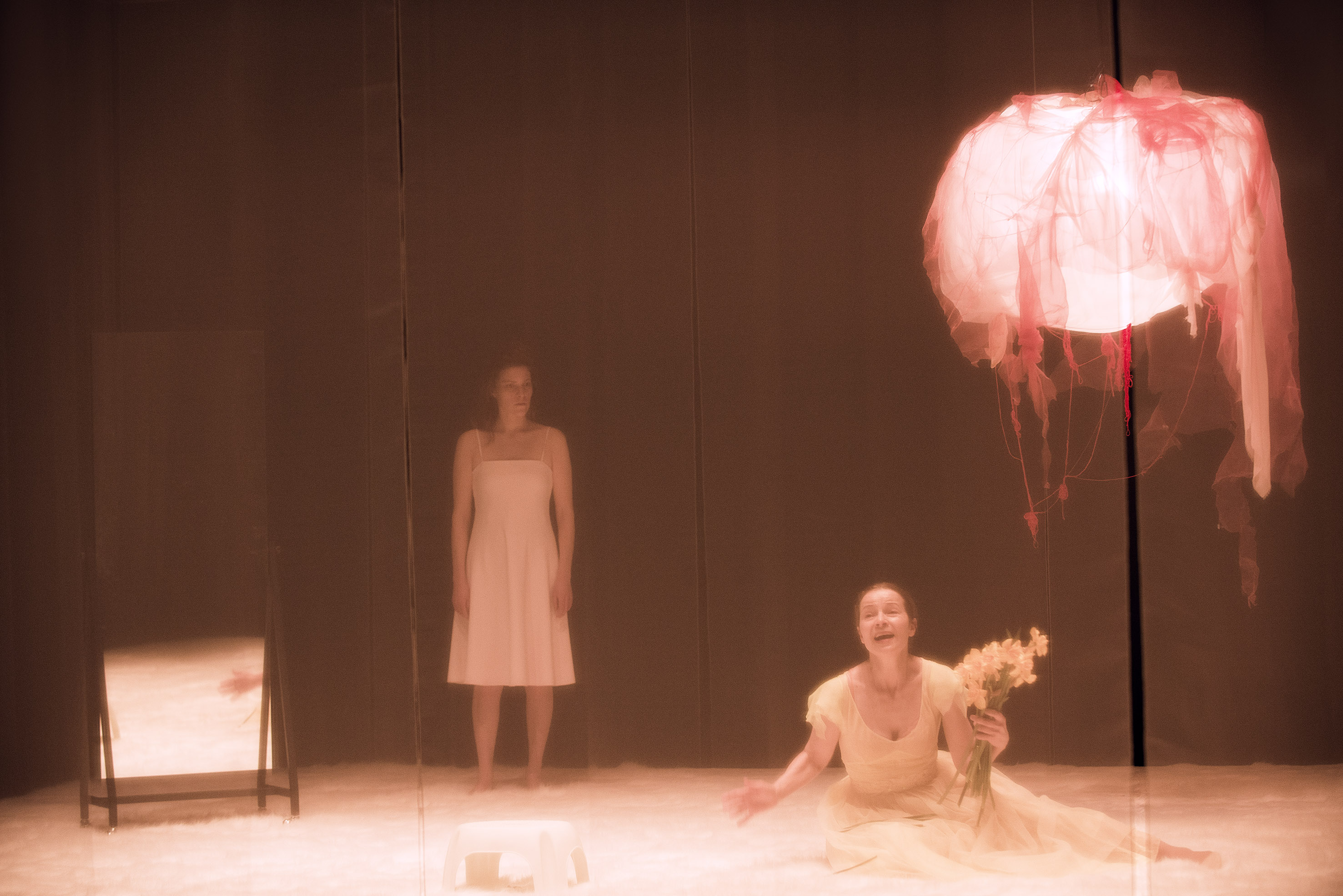 Sur le plateau est matérialisé dès le départ le nid dans lequel la mère confine ses petits. Les comédiens évoluent sur un matelas épais et enfermés dans des murs de voiles, dont ils ne sortent que rarement. Si l’image est claire, et si les caractères nous sont dissimulés au premier abord, c’est à la fois une bonne idée et une frustration. On se sent rapidement exclus des rapports, on attend qu’ils s’approchent de nous. Même sentiment face aux noirs entre les scènes, qui nous coupent encore davantage de l’ambiance toxique de l’appartement, ou bien à l’utilisation constante du son. Un bruit de fond incessant tente de créer la tension, mais empêche que le dialogue ne parvienne vraiment.