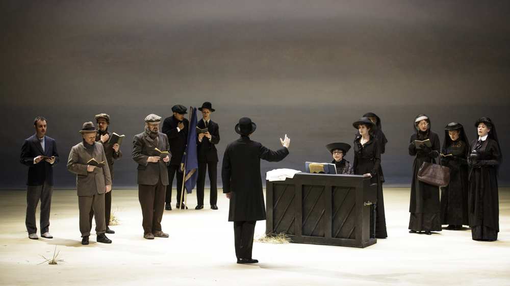 La mer d’Edward Bond est un drame romanesque où se réunissent des figures déchirées d’hommes et de femmes, embarquées dans un ressac de souvenirs et d’espoirs déchus qu’une vie conformiste sclérosée a cimentés. Figure majeure du théâtre contemporain, l’auteur anglais né en 1934 à Londres parcourt les vies brisées par les conventions et les mœurs trop rigides imposées par la société. La mer, c’est d’abord une image, puis un son, et enfin un courant où tous les éléments confluent et se mêlent, à l’image du drame. Dans une petite ville qui borde la mer, Suffolk, en Angleterre, le corps inerte de Colin est retrouvé, et dont celui-ci sera pour chacun d’entre eux la source de leurs angoisses. Il va concentrer toutes les passions d’une ville sans trouble et la précipiter dans un chaos d’où surgiront ces fêlures, ces maux qu’une fausse quiétude d’une ville sans souci a étouffé. Ces personnages dont les inspirations et les désirs se bousculent, ces êtres aspirés dans des abyssesinsondables et vertigineux nous plongent – grâce au talent des interprètes et à leur sensibilité forte – dans un monde glacé, fruit des masques que chacun porte. La scénographie élaborée avec goût propose une toile suggérant la mer en arrière-fond, un mobilier bourgeois évoquant le début du 20ème siècle pour les scènes intérieures, et enfin une grande toile noire maculée de taches blanches couvre la scène aux changements de décor, lors des intermèdes. Nous retiendrons les présences de Cécile Brune qui tout en finesse joue le rôle de Louise Rafi, Hervé Pierre est intrépide dans celui de Hatch, Pierre Louis-Calixte interprète avec humour et gravité le rôle de Thompson et Adeline d’Hermy est fascinante dans le rôle de Rose Jones. La mise en scène tout en subtilité amène les spectateurs à découvrir, au fur et à mesure des images, l’amertume et les espoirs brisés de ces vies. Nous saluerons la direction d’acteur impeccable d’Alain Françon qui restitue pleinement la force et le trouble des personnages. La mer, théâtre politique au bord du pessimisme, soulève la question essentielle du rapport à l’autre et à nous-mêmes quand les masques tombent.
