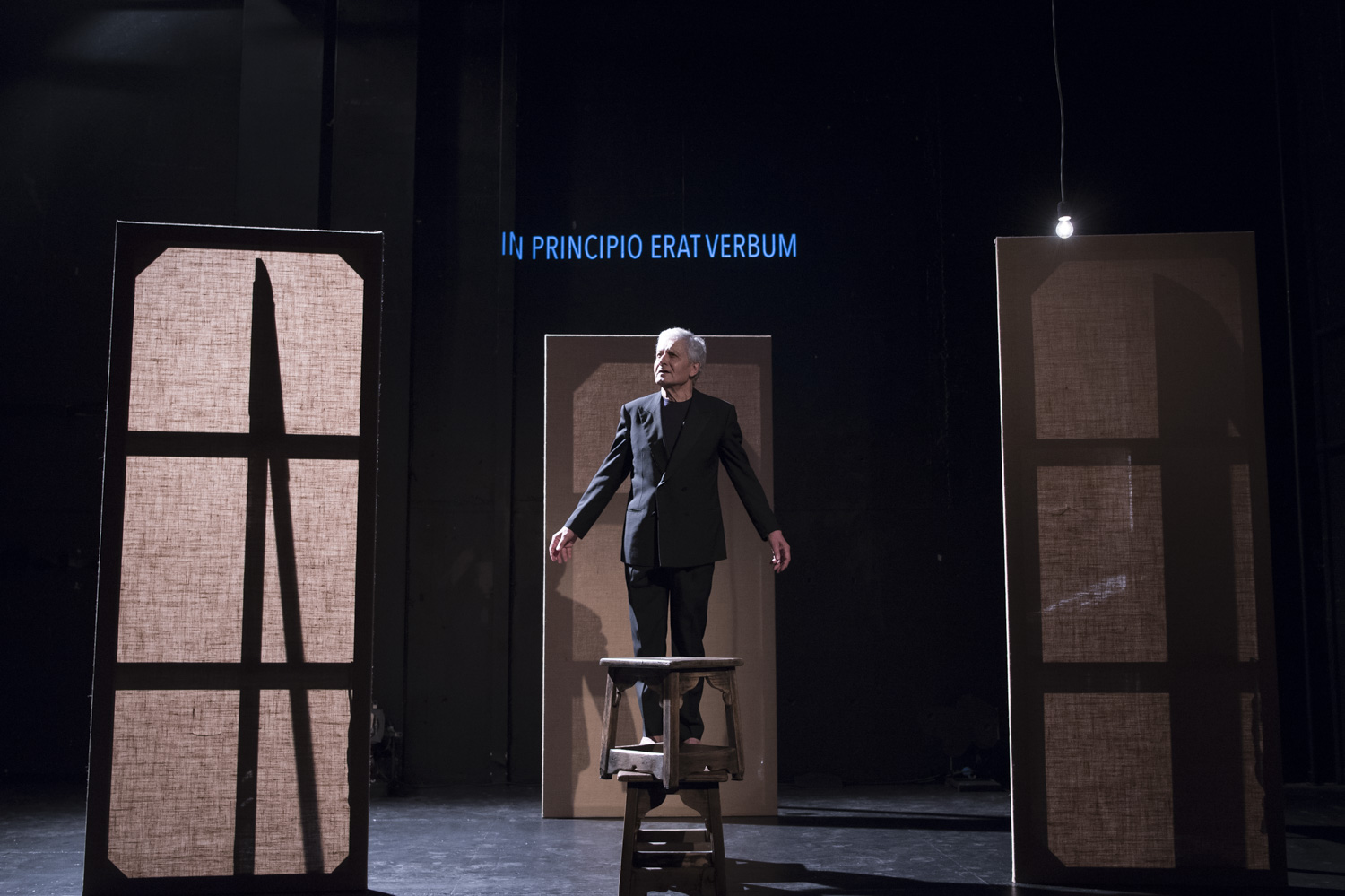 La messe là-bas n’est pas un texte facile, Golgotha d’hermétisme par instant si Didier Sandre n’avait pas décomposé chaque strophe comme une partition musicale, balancements de la houle, ondulations des palmiers, allégresse et humour. On songe à ces mots de Grotowsky « nous sentons qu’un acteur atteint à l’essence de sa vocation quand il s’engage dans un acte de sincérité […] modelé dans un organisme vivant, des impulsions, une manière de respirer, dans un rythme de pensée et la circulation du sang ». Beauté du silence entre les stances, un théâtre de l’être avec 3 tabourets et quelques paravents. Le comédien aux pieds nus dessine d’une main les méandres invisibles d’une pensée suspendue qui peut s’amuser des « chrétiens du dimanche » et de leur pratique d’habitude, « ce n’est pas que ce soit intéressant, et ce n’est pas positivement que l’on s’ennuie, chacun sait simplement qu’on est là pour attendre que ce soit fini », pour l’instant d’après s’adresser d’homme à homme à Rimbaud dont il loue la recherche passionnée de vérité dans l’art « Rimbaud, pourquoi t’en vas-tu, et pourquoi est-ce toi une fois de plus comme sur les images, l’enfant qui quitte la maison vers la ligne des sapins et vers l’orage ».