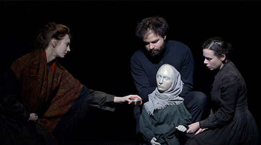 Heureusement, plusieurs choix sont des réussites. D’abord l’idée audacieuse de faire incarner Tintagiles par un pantin se révèle très riche. Le visage impassible et d’une blancheur de marbre contraste avec toute l’étrangeté que le texte peut faire surgir. Le trouble devant cet enfant désincarné est renforcé par le comédien qui lui prête sa voix. Ce ton inexpressif et monocorde à travers lequel passent des mots d’enfants renforce le malaise lugubre dont est imprégné le texte.
