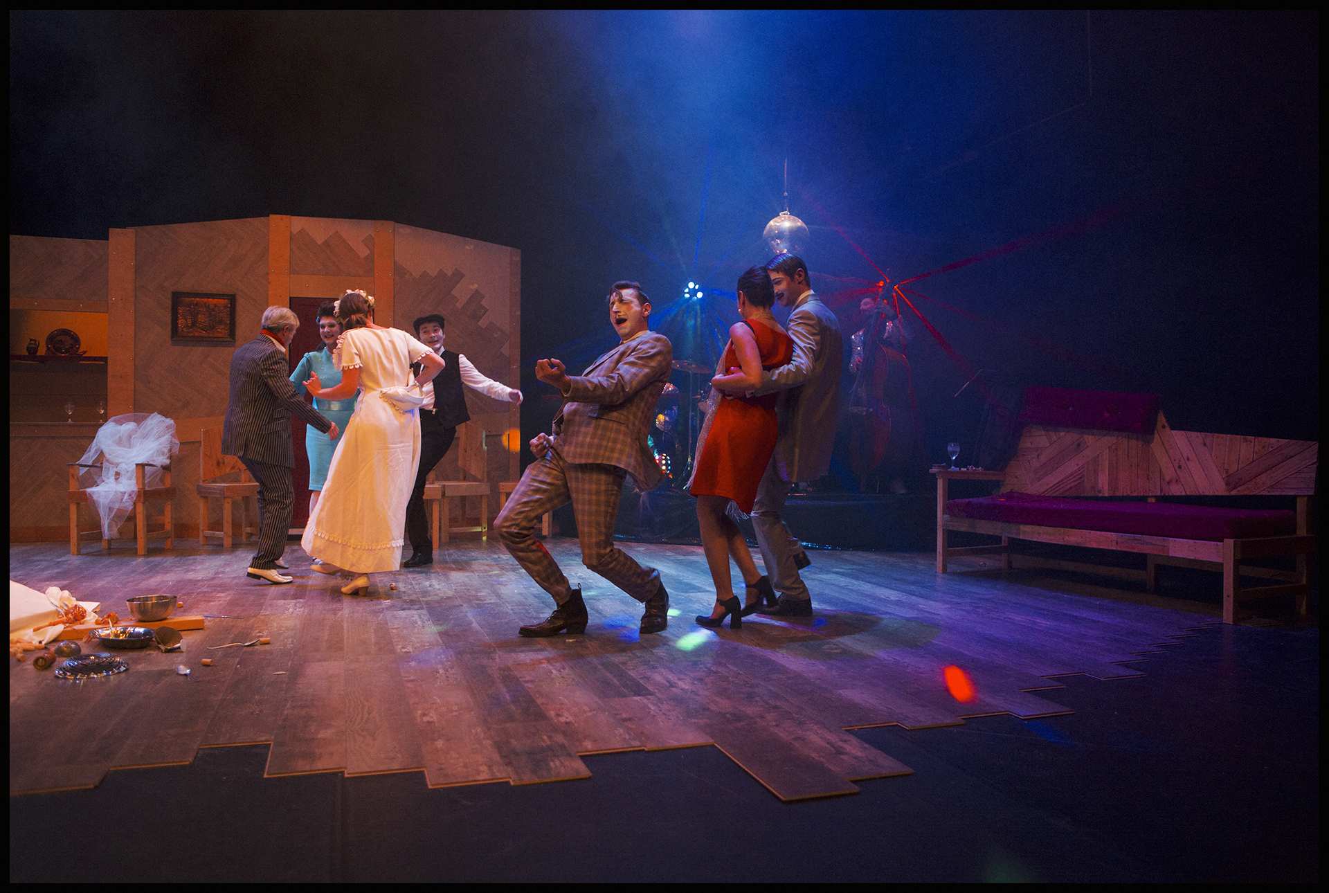 Jeu de massacre jubilatoire ou comment une noce tourne à l’aigre. Comme le mobilier, ici tout se déglingue et finit par s’écrouler. Portrait au vitriol d’une petite bourgeoisie aigre, mesquine et méchante. Un chamboule-tout qui n’épargne personne. Rancœurs enfouies, jalousies, acre mesquinerie, ils sont veules, bêtes et méchants. Vulgaires et obscènes sous le vernis policé vite craquelé et le poncif de la bienséance. L’idéal bourgeois d’un confort douillet et d’une économie domestique, aussi bancal que les chaises, vole en éclat, s’effondre comme la table du banquet autour de laquelle la langue avinée et assassine se délie, et les préjugés frelatés se délitent sans vergogne. Bertolt Brecht dont c’est une des premières œuvres, 1926, pointe la défaite idéologique de l’Allemagne. La guerre est déjà là, au sein de cette petite bourgeoisie individualiste et revancharde, ventre fécond d’où surgira la bête, bientôt tentée par le nazisme. Comme avant la nuit de noce, sur ce champ de ruine dans cet appartement vite ravagé, tout est déjà consommé. C’est une farce féroce, une charge énorme. Le rire claque certes mais n’est que l’expression d’une ironie mordante sur le tragique et le pathétique de ces existences riquiquis gonflées d’importance et de ridicule. Et c’est monté comme ça, avec cette virulence et cet excès propre au burlesque par Olivier Mellor. La parole est un flot, un fleuve qui ne se tarit brièvement que dans le silence d’une gêne soudaine, d’un malaise passager devant les saillis lâchés comme par inadvertances, en toute fausse innocence, et qui révèlent des vérités peu ragoutantes. Les corps, comme le mobilier, finissent par se démancher salement sous les coups de boutoirs de désirs sexuels refoulés, engoncés dans un savoir-vivre mal dégrossi. Circulation des corps, circulation de la parole, c’est une ronde infernale, à vous donner le vertige, au rythme d’un orchestre de balloche endimanché, témoin emprunté, un brin embarrassé quand même devant cette dévastation générale. Olivier Mellor casse la baraque, les acteurs de même, dans tous les sens du terme. Ça manque un peu de nuance peut être, parfois, mais ce qui semble importer ici c’est cette énergie furieuse et ravageuse qui emporte les personnages dans une surenchère destructrice qui finit par se retourner contre eux. On peut juste regretter que cette acidité crachée qui ronge chacun ne s’étiole les invités partis, les jeunes mariés restés seuls. Une réconciliation sur l’oreiller, même explosive, semble balayer soudain les gravats amoncelés préfigurant leur avenir.