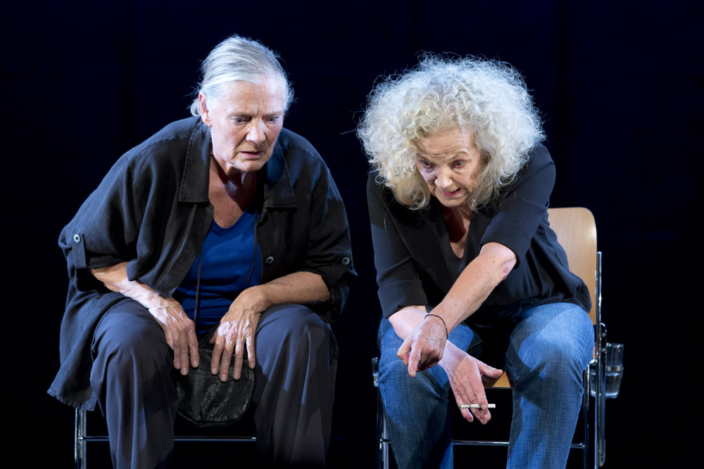 Jurassique Parc. Deux vieilles vissées sur leurs chaises attendent. Pas une visite de courtoisie, non. Des visiteurs qui viendront là comme on visite un monument, une ruine, une espèce bientôt disparue. Constater que, oui, la vieillesse est un naufrage. En l’attente de cette venue qui tarde, qui probablement n’adviendra plus, dans ce monde devenu aseptisé où pas un moucheron, pas une blatte dont on garde la nostalgie n’a résisté, où le gluten n’est plus qu’un fort lointain souvenir, les cigarettes prohibées, l’odeur même des champignons susceptible d’alerter la brigade sanitaire, ces deux-là donc s’engueulent sec. Se battent, s’insultent le verbe haut comme des chiffonnières, se traitent de vieilles peaux, ce qu’elles sont et revendiquent crânement dans cet univers javellisé où rodent des drones s’abattant autour de vous sans crier gare. Chacune cherche sa place, se défie, se rabiboche dans cet espace ouvert se résumant à cette chaise louée en viager qu’elles ne quitteront pas. Avant de s’apprivoiser et trouver ensemble la sortie, se lever et foutre le camp. Ces deux-là sont Tania Torrens et Catherine Hiegel. Et elles s’en donnent à cœur joie à défendre ce texte de Pierre Notte écrit sur mesure pour ces deux monstres sacrés, auquel elles ont collaborés. Qui dézinguent leur image avec maestria et jubilation. Ou au contraire en joue comme un pied de nez. L’élégance et la classe de Tania Torrens qui dans le doute, pète. Qui affirme qu’elle fut comédienne ayant joué Tchékhov. Evidemment. Ou Catherine Hiegel surjouant de sa réputation d’atrabilaire. Quand l’une réussit à jouer son Parkinson pour épater sa voisine, l’autre échoue à composer un Alzheimer. Complices elles le sont merveilleusement dans ce duel fratricide comme elles le sont dans la vie, elles qui débutèrent ensemble ou presque au Théâtre Français avant d’en devenir sociétaires. C’est de ça sans doute dont elles tentent de se débarrasser ici, de leur emplois qui vous collent, quand il y en avait encore. Ou de le tordre, d’en finir, quand la gueule ne suit plus et qu’on accepte la vieillesse sans collagène. On sait le drame des actrices vieillissantes. Demandez aujourd’hui aux comédiennes de cinquante ans… Ici la réponse est cinglante, voire définitive. Ce n’est, malgré tout, pas le meilleur texte de Pierre Notte. La folie quotidienne et douce qui fait le sel de ces textes, son surréalisme poétique voire merveilleux, lui le fils spirituel de Marcel Aymé, manque ici. Malgré le rire qui secoue sporadiquement la salle, quelque chose bientôt boite et tourne en rond. Il y a bien des fulgurances, des répliques percutantes et vachardes (mention spéciale : « il est raté votre Alzheimer ! ») proféré avec une évidente gourmandise mais cela reste somme toute un exercice d’admiration. Pierre Notte sans doute n’a pas dû vouloir oser déborder les comédiennes, lâcher la bride. C’est contre elles, leur histoire et leur talent qu’il semble butter et ne s’affranchit pas. Reste une « fin de partie » plus récréative qu’existentielle et tragique et deux formidables comédiennes, deux vieilles à visiter.