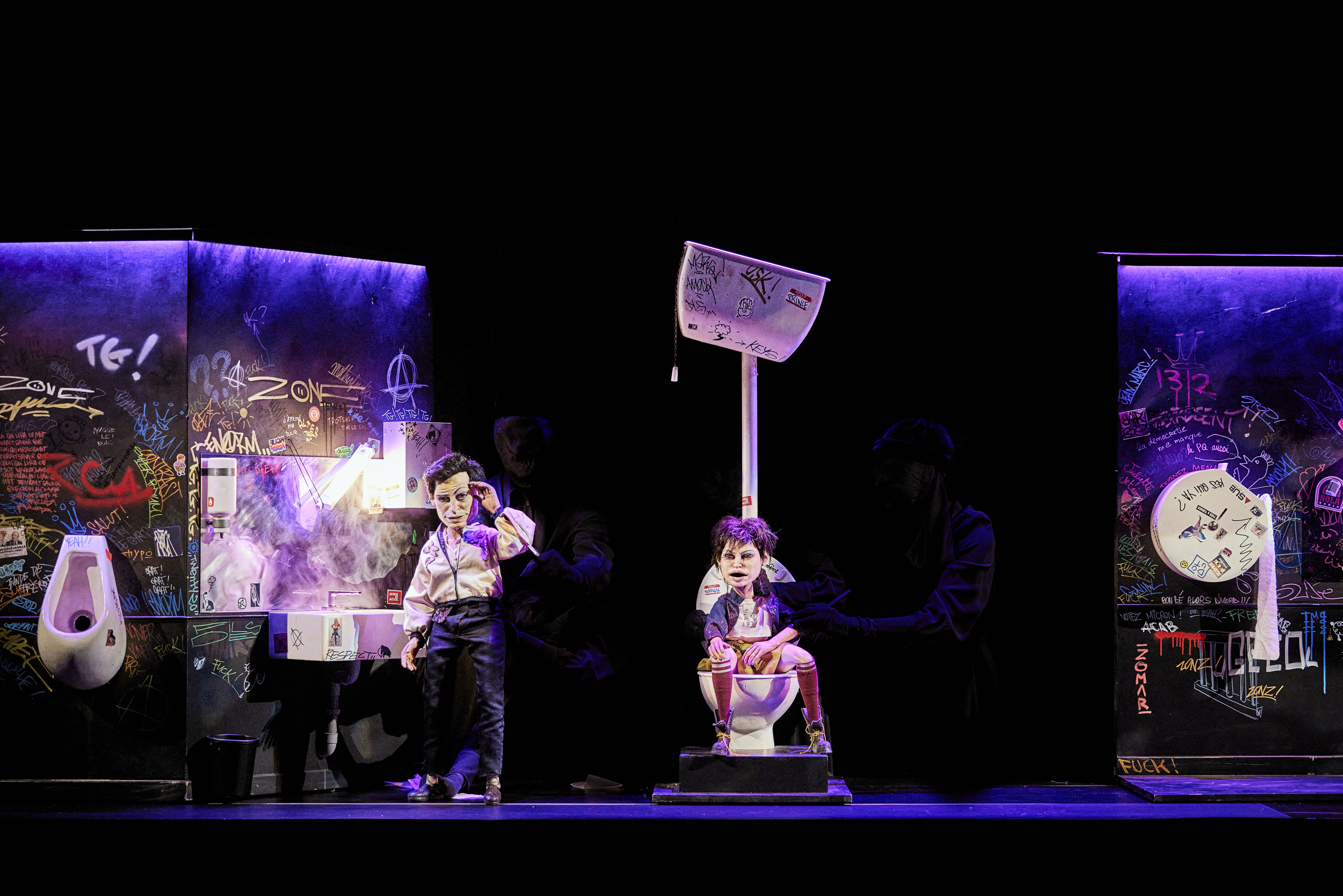 Mais on aurait tort de ne retenir que ça. Parce que ça, justement est toujours en situation, rien de gratuit, jamais. Et qu’il est question aussi beaucoup d’amour et de la place que le sexe y occupe, ou pas. Ce qui est raconté avec sensibilité et justesse, ce sont des parcours de vie croisées où la sexualité participe de la révélation de soi. Hétéro, homo, bi, asexuel, jeunes, vieux, cisgenre, transgenre, binaire ou non… Hommes fragiles ou femmes puissantes, c’est une ronde inclusive où jouir est un acte libératoire, qui ose s’affranchir des tabous pour atteindre une vérité, une conviction intime participant de la construction de soi. Il n’y pas jusque la mort qui ne soit évoquée, où la petite mort rejoint la grande dans la volonté d’en finir, le dernier acte d’une vie liant en un geste d’amour Eros et Thanatos. Johanny Bert signe avec Yann Verburgh à l’écriture une création qui n’édulcore rien, foutrement transgressive et subtilement subversive, mais laisse place aussi à la poésie. S’envoyer en l’air n’est pas qu’une expression ici qui voit nos amants planer pendant le coït. Et on ne s’étonne pas de découvrir une centaure en domina. Encore moins d’un sexe démesuré servir de lasso. Même un rapport sexuel dans les toilettes sordides d’une boite de nuit sont l’occasion d’une mise en scène stupéfiante où si l’on ne voit rien de l’acte, urinoirs, cuvette de wc et rouleau de papiers prennent en charge ardemment cette partie de jambes-en-l’air. Et, ô douce ironie, le seul humain qui traverse cet univers est réduit à n’être qu’un androïde, objet sexuel répondant à tous les fantasmes avoués de nos marionnettes. Nous tairons, non par pudeur, l’usage particulier qui en est fait ici. La mise en scène inventive, les tableaux se succèdent en glissant, l’esthétique extrêmement soignée de la scénographie, l’écriture fine puisant sa source dans des témoignages originaux, la musique en live et surtout les marionnettes à qui nous prêtons très vite une personnalité, un vrai caractère qui nous font oublier la manipulation par les comédiens qui prêtent avec justesse leur voix en s’effaçant derrière elles, participent à la réussite de cette carte contemporaine du tendre revisitée version hardcore, cette ronde où jouir sans entrave n’est que l’affirmation frondeuse et vitale de notre identité et liberté.