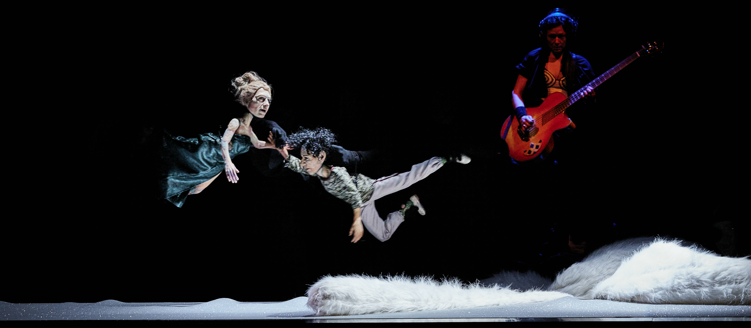 Mais on aurait tort de ne retenir que ça. Parce que ça, justement est toujours en situation, rien de gratuit, jamais. Et qu’il est question aussi beaucoup d’amour et de la place que le sexe y occupe, ou pas. Ce qui est raconté avec sensibilité et justesse, ce sont des parcours de vie croisées où la sexualité participe de la révélation de soi. Hétéro, homo, bi, asexuel, jeunes, vieux, cisgenre, transgenre, binaire ou non… Hommes fragiles ou femmes puissantes, c’est une ronde inclusive où jouir est un acte libératoire, qui ose s’affranchir des tabous pour atteindre une vérité, une conviction intime participant de la construction de soi. Il n’y pas jusque la mort qui ne soit évoquée, où la petite mort rejoint la grande dans la volonté d’en finir, le dernier acte d’une vie liant en un geste d’amour Eros et Thanatos. Johanny Bert signe avec Yann Verburgh à l’écriture une création qui n’édulcore rien, foutrement transgressive et subtilement subversive, mais laisse place aussi à la poésie. S’envoyer en l’air n’est pas qu’une expression ici qui voit nos amants planer pendant le coït. Et on ne s’étonne pas de découvrir une centaure en domina. Encore moins d’un sexe démesuré servir de lasso. Même un rapport sexuel dans les toilettes sordides d’une boite de nuit sont l’occasion d’une mise en scène stupéfiante où si l’on ne voit rien de l’acte, urinoirs, cuvette de wc et rouleau de papiers prennent en charge ardemment cette partie de jambes-en-l’air. Et, ô douce ironie, le seul humain qui traverse cet univers est réduit à n’être qu’un androïde, objet sexuel répondant à tous les fantasmes avoués de nos marionnettes. Nous tairons, non par pudeur, l’usage particulier qui en est fait ici. La mise en scène inventive, les tableaux se succèdent en glissant, l’esthétique extrêmement soignée de la scénographie, l’écriture fine puisant sa source dans des témoignages originaux, la musique en live et surtout les marionnettes à qui nous prêtons très vite une personnalité, un vrai caractère qui nous font oublier la manipulation par  les comédiens qui prêtent avec justesse leur voix en s’effaçant derrière elles, participent à la réussite de cette carte contemporaine du tendre revisitée version hardcore, cette ronde où jouir sans entrave n’est que l’affirmation frondeuse et vitale de notre identité et liberté.