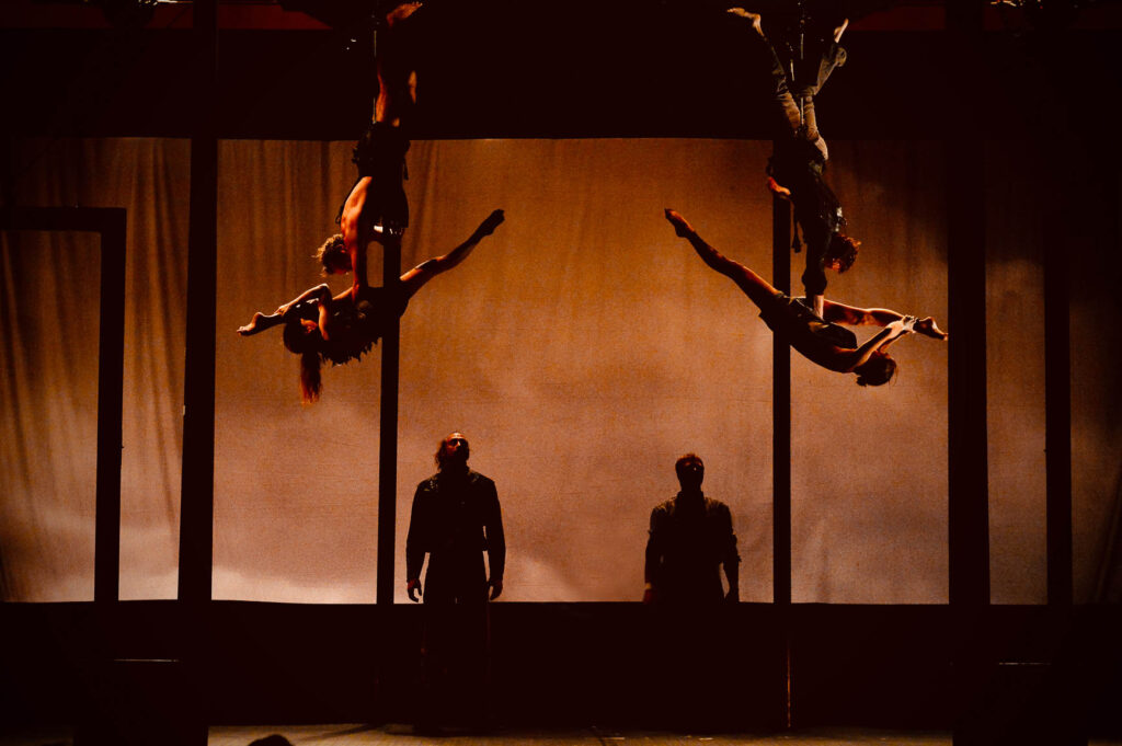 Ces funérailles se transforment alors en vaudeville, avec portes qui claquent, règlements de compte, pleurs et rires entremêlés et ivresse en guise de cerise sur le gâteau. Il est rare qu’un spectacle de cirque développe une telle dramaturgie et soit empreint d’un humour aussi burlesque. On est sans cesse surpris par la tournure que prend l’histoire. Et quand celle-ci laisse place tout en fluidité à des tableaux acrobatiques, on s’en délecte d’autant plus. Ces six personnages hauts en couleurs se meuvent alors en corps poétiques, déjouant la gravité et frôlant tous les déséquilibres.
