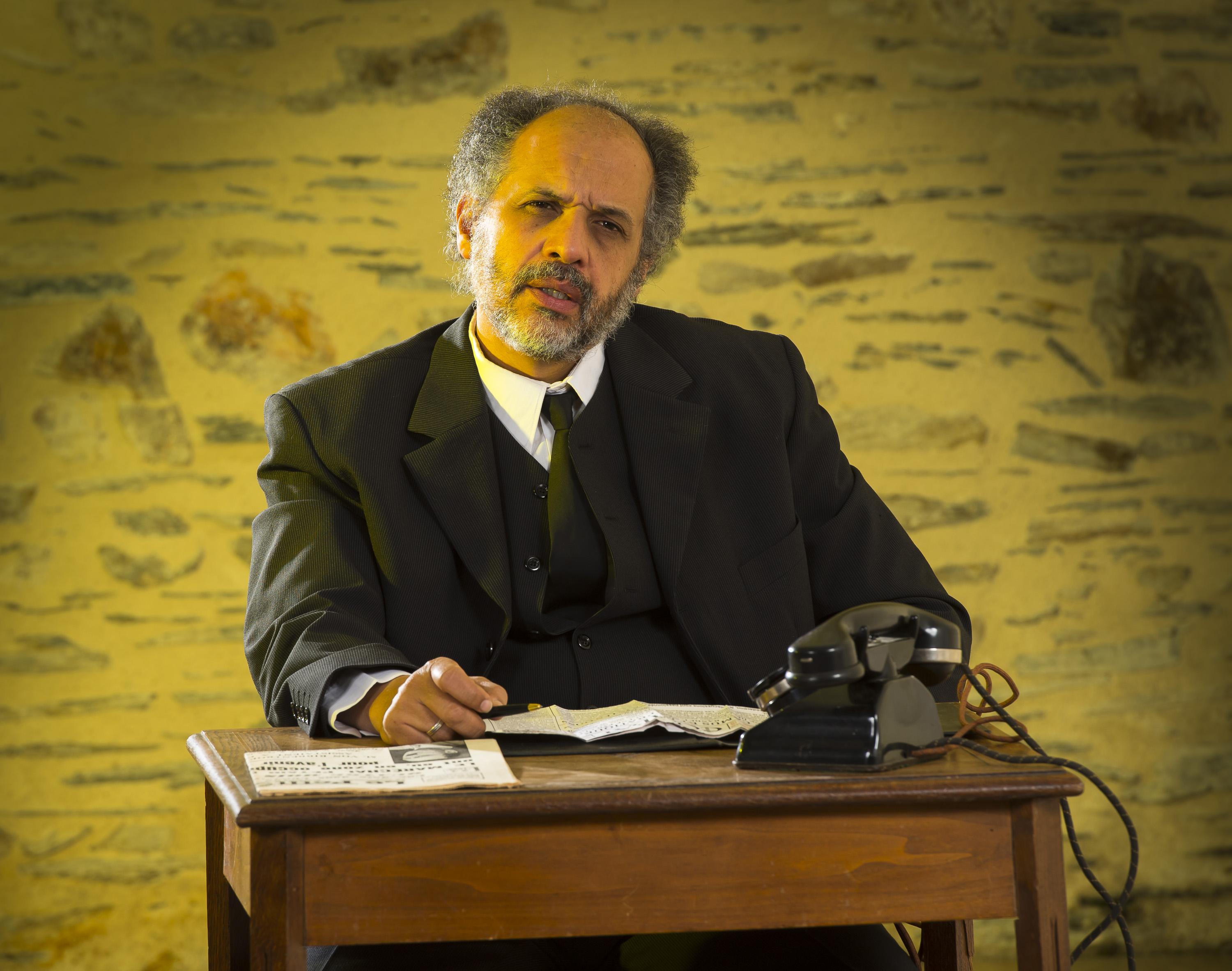 C’est toute une aventure que d’aller au Théâtre des Déchargeurs, lieu très atypique en plein centre de Paris. Ainsi on accède à la salle par des escaliers qui paraissent nous emmener vers les entrailles de la Terre et nous voilà installés dans une petite salle pouvant accueillir peut-être quarante personnes maximum. La salle semble manger le plateau. Ou le plateau manger la salle ! Cela crée une très grande promiscuité avec l’action au plateau. Nous sommes ainsi tous ensemble et la démarcation habituelle plateau – public n’existe pas. Le plateau est minuscule, y sont disposés un bureau, une chaise, un téléphone, le tout dans un style des années 1930-1940.