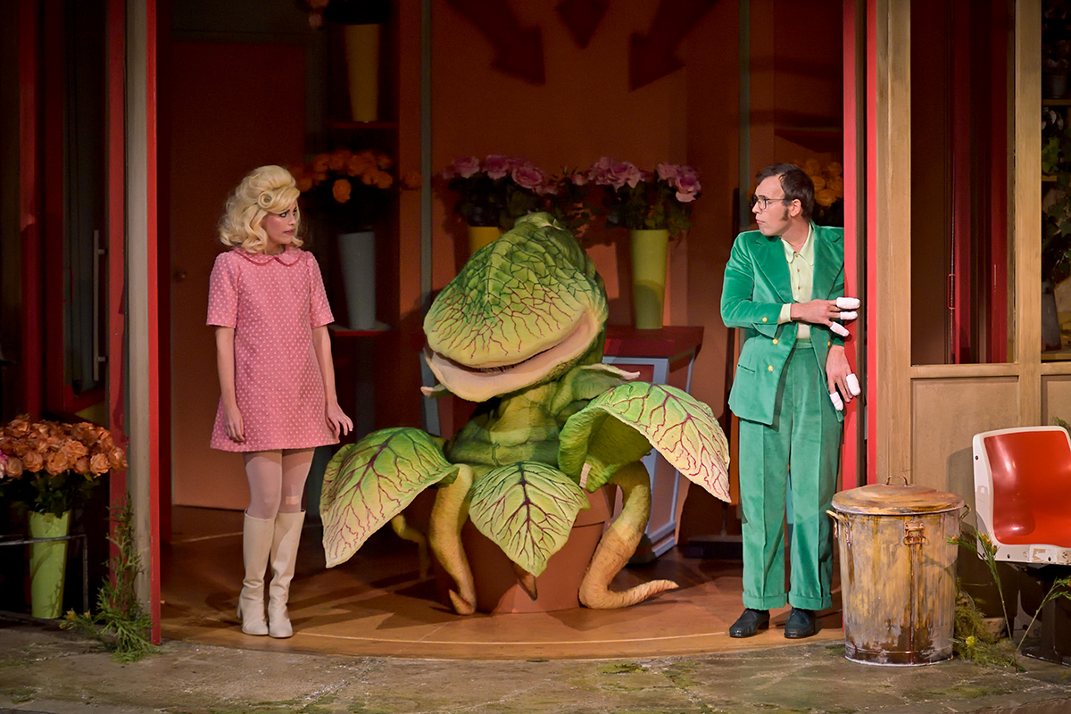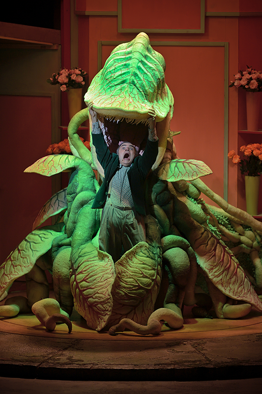 Or-donc, L’Opéra-Comique en ce début d’hiver se met au vert saignant. La Petite Boutique des horreurs, ce fut deux films cultes (1960 et 1986), et une comédie musicale de 1982, jouée dans le off-off Broadway de New-York, écrite par Howard Ashman et composée par Alan Menken, ce dernier compositeur pour Walt Disney. C’est cette dernière version qui est jouée là, dans une adaptation française de 1985 d’Alain Marcel (jouée au Théâtre Déjazet en 1986) et une orchestration aujourd’hui plus étoffée par Arthur Lavandier mais toujours respectueuse des influences musicales jazzy, pop, country et rock et surtout du gospel. Une musique issue de la rue et des minorités. Parce que mine de rien, La Petite Boutique des horreurs parle bien de ces petites gens et de leur rêve d’émancipation, cette envie d’aller voir ailleurs, sortir du ghetto, être un jour « au cœur du vert » comme le chante si bien Audrey, qui ne croit pas si bien dire en ce qui la concerne… Ce qu’il y a de formidable c’est que chacun ici des personnages, stéréotypés comme il se doit, est caractérisé par une tonalité musicale qui lui est propre signant un multiculturalisme étonnant, un vivre ensemble que réunit dans ce ghetto la misère et la lutte des classes. Fable trash et écolo avant l’heure sans doute, mais également fresque sociale évidente.