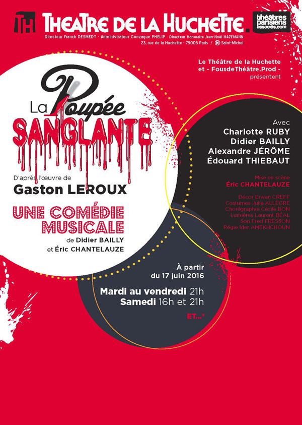 Il n’y a rien de plus de difficile que de créer la légèreté, la fantaisie, le suspense, sur scène. Ce sont autant de sensations de spectateur que le théâtre risque de rendre quotidiennes, singées, surjouées. Et les exemples ne manquent pas. Assumant totalement le genre du mystère bourgeois, et celui, théâtral, de la comédie musicale un peu rétro, La poupée Sanglante gagne son pari en faisant rire, en faisant applaudir, mais sans faire l’impasse sur la technique et sur le rythme. Avec quelques idées de mise en scène simples déployées tout au long du spectacle (écoute des comédiens hors jeu, accessoires symboliques des différents personnages, narration à la troisième personne par les comédiens), ce spectacle est à la fois ambitieux et sans prétention. Enthousiasmante poupée.