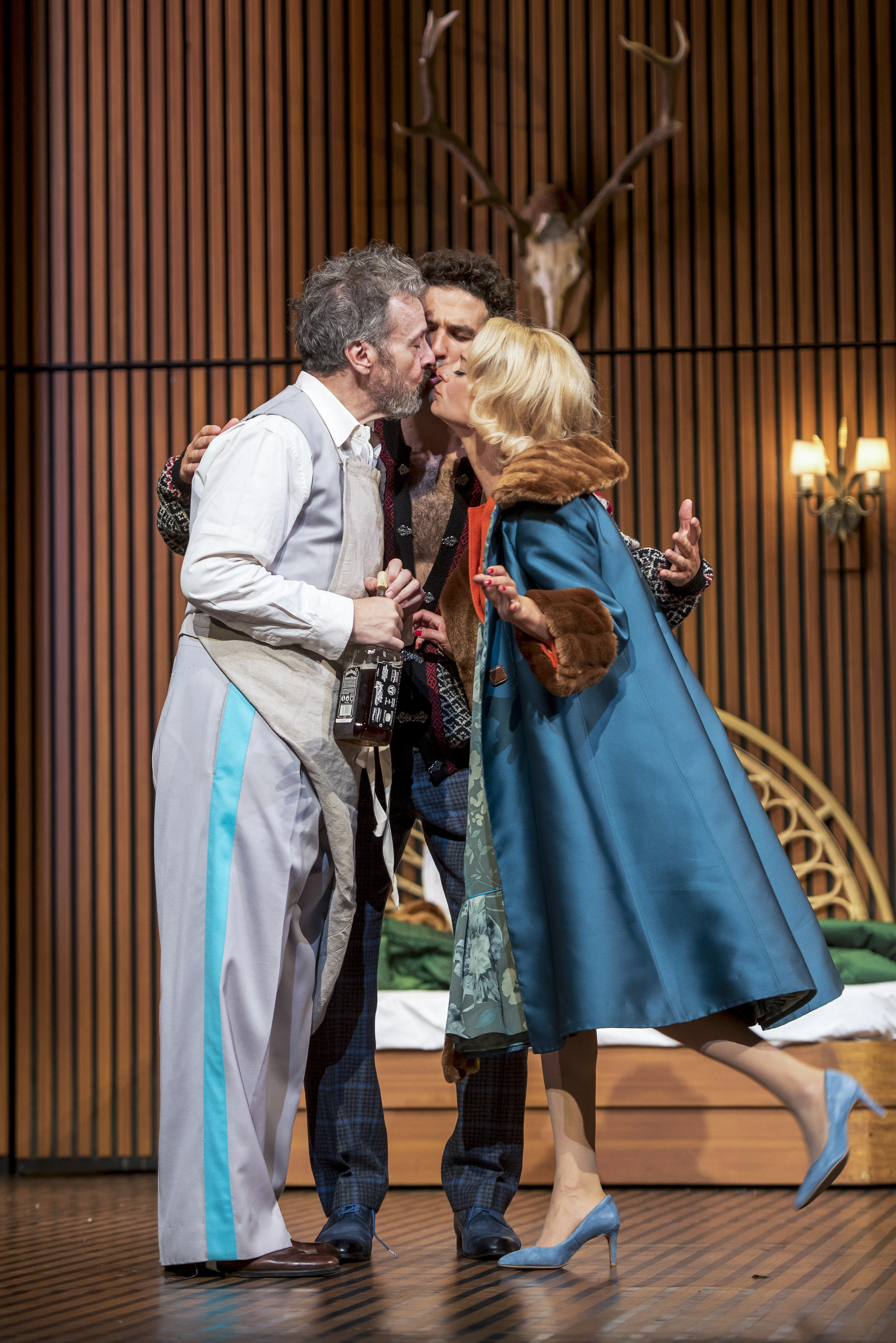 Lilo Baur fait prendre l’air à nos petits bourgeois. Fini le confinement parisien, les toilettes empesées, les décors Belle Époque. Les voilà quelque part en province, il neige dehors, c’est Noël. Nous sommes dans les années 60, si joliment colorées, si pop et si sage. Dans cet intérieur ouvert vers l’extérieur, un aquarium en quelque sorte, tout est chic, tout est glamour, des meubles aux tenues portées par nos quidams. Ne manque pas, comme une évidence, les bois de cervidés au-dessus de la cheminée… Et quelques notes de mauvais goût, un coucou suisse velléitaire par exemple. Mais derrière ce vernis glacé de pages de magazines, modes et travaux, couve l’hystérie. Il suffit de peu, d’une paire de bretelles, d’un sosie, pour que tout ça explose fissa. Un véritable feu d’artifice pétaradant et qui crame chacun, les laissant à vif, à nu. Lilo Baur respecte la haute précision horlogère de Feydeau, difficile d’y échapper. Mais à ce formidable et ingénieux carcan elle ajoute, louchant ouvertement vers Tati et Blake Edwards, le burlesque et l’élégance. Mais cette élégance-là est un faux-nez, le chic est toc, tant les conventions s’effondrent, les comportements se dérèglent vite, les corps se décomposent, les relations se délitent. La mécanique sociale hoquète et s’enraye. La mécanique humaine déraille. Cette présomption d’adultère dénonce chez chacun les fantasmes inavoués qui vous tenaillent, et soudain prêts d’être potentiellement réalisés sans jamais pourtant franchir le pas. Il n’y a que les domestiques pour le faire sans état d’âme aucun. Et c’est dans cet hôtel borgne, hors de chez soi, hors de soi, que cette mécanique de cartoon déchaîné révèle chacun dans sa folie, ses failles, ses contradictions, sa vérité et atteint son apogée. On retrouve là, exacerbée, cette mise en circulation chaotique des corps propre à Feydeau, leur approche sans cesse différée et repoussée. On se cherche, on se fuit. On se cogne. Les acteurs, dans cette ronde infernale, jubilatoire pour les spectateurs toujours en avance sur les personnages et en attente fébrile de la catastrophe, dirigés au plus près, atteignent très vite des sommets, et ils sont hauts, dans la folie et le mensonge qui les engouffrent corps et bien. Totalement débridés, inventifs, mais fermement tenus par Lilo Baur, dans cet état de panique totale et d’urgence absolue qui les propulse toujours plus loin dans l’absurde, ne maîtrisant plus rien, ils sont tout simplement formidables tant ils montrent une belle et forte appétence à dessiner leur rôle, saisir leurs personnages dans leur pleins et déliés, leur loufoquerie involontaire, sans jamais tomber dans l’outrance et la caricature. Et le spectateur de s’exclamer comme nos personnages, sacrée puce !