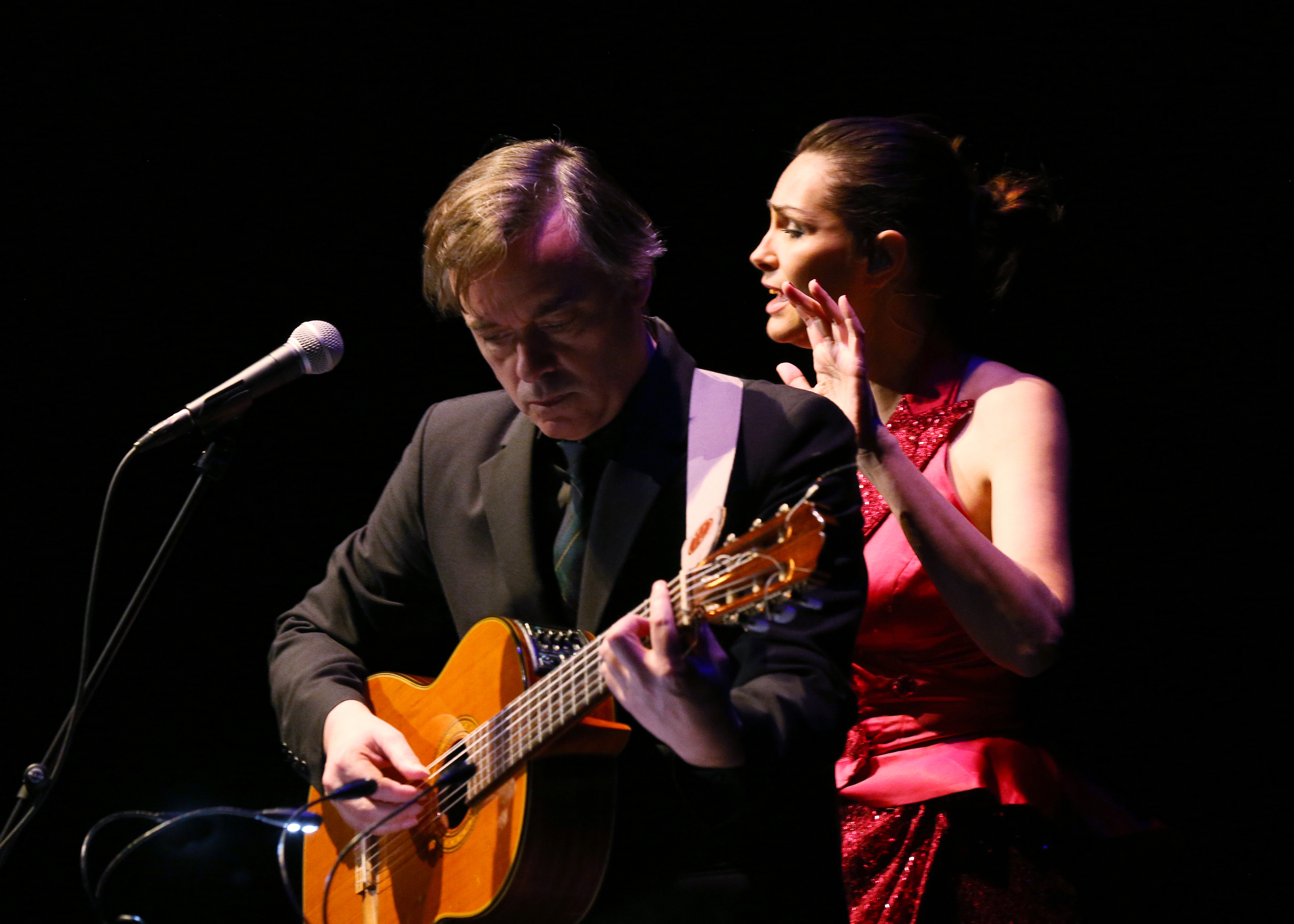 For ever Helena. Voilà une petite merveille concoctée par Helena Noguerra et Pierre Notte, joliment complices sur cette affaire. Théâtre musical, entre cabaret et récital, humour noir en sautoir pour une drôle de cérémonie funèbre, où ces deux-là se sont entendus, on le voit, comme larrons en foire. Helena Noguerra interprète ses propres chansons, toutes finement ciselées, petits bijoux de mélancolie et de désenchantement incrustés dans le récit poétique de Pierre Notte, au réalisme mêlé de fantaisie et de fantastique, on reconnait-là son univers à nul autre pareil, entre gravité et apesanteur. Et ce qui est remarquable, c’est combien ces deux écritures, ces deux voix, loin de se heurter, sont au contraire en parfaite harmonie, qui se répondent, dialoguent, et se font écho, de l’une à l’autre, avec une grande fluidité. C’est une histoire tragique, un polar sombre où la liberté d’aimer, la liberté tout court, se paie au prix cher, au prix du sang. Portrait d’une femme assassinée, féminicidée, on dira ça comme ça, qui hante, fantôme désormais, son passé. Il y a ces colliers de jules pour l’ennui, amants et amantes d’un soir ou plus, qu’on dénoue au petit jour comme le chantait madame Juliette Gréco. Ces amours mortes-nées, ces amours passées, ces amours défuntes et ces visages inoubliables vite oubliés. L’amour fou, aussi, et les désillusions post-coitum. Il y a monsieur Paul et mademoiselle Julie. Et le dernier, fatal, forcément fatal, l’amour à mort dans ce bar belge, l’Hemingway, où votre sang se mêle bientôt aux flaques de sauce barbecue. Helena Noguerra chante donc ses propres chansons mais se glissent ici et là, discrets hommage, Barbara et Dalida qui en connaissaient un rayon dans les amours déglinguées. Et plus gonflé et crâne, qui ouvre ce tour de piste, Jacques Higelin et son iconique Champagne pour planter fermement le décor. Tristes sont les cimetières, oui, mais passé l’antichambre, l’au-delà est un dancefloor, boules à facettes au plafond et dans la tête, où le rouge flamboyant et les paillettes effacent le noir de l’existence et les bleus à l’âme. Mise en scène sans chichi, sobre, Pierre Notte sait y faire pour aller sans s’égarer à l’essentiel, mettre à nu les personnages, exhausser les comédiens, où éclate de fait le talent fou et généreux d’Helena Noguerra chanteuse-comédienne, les deux allant de pair ici. Reine de la piste, oui, reine en son domaine et qui une heure trente durant tient royalement et sans faiblir, sans l’once d’un relâchement, sans fausse-note et sans faux-semblant, le destin tragique de son personnage.